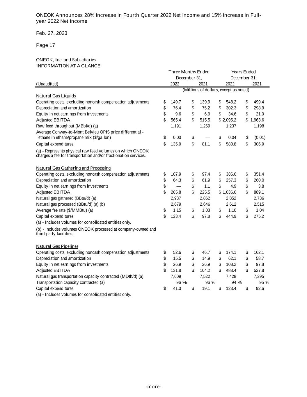ONEOK Announces 28% Increase in Fourth Quarter 2022 Net Income and 15% Increase in Full- year 2022 Net Income Feb. 27, 2023 Page 17 -more- ONEOK, Inc. and Subsidiaries INFORMATION AT A GLANCE Three Months Ended Years Ended December 31, December 31, (Unaudited) 2022 2021 2022 2021 (Millions of dollars, except as noted) Natural Gas Liquids Operating costs, excluding noncash compensation adjustments $ 149.7 $ 139.9 $ 548.2 $ 499.4 Depreciation and amortization $ 76.4 $ 75.2 $ 302.3 $ 298.9 Equity in net earnings from investments $ 9.6 $ 6.9 $ 34.6 $ 21.0 Adjusted EBITDA $ 565.4 $ 515.5 $ 2,095.2 $ 1,963.6 Raw feed throughput (MBbl/d) (a) 1,191 1,269 1,237 1,198 Average Conway-to-Mont Belvieu OPIS price differential - ethane in ethane/propane mix ($/gallon) $ 0.03 $ — $ 0.04 $ (0.01) Capital expenditures $ 135.9 $ 81.1 $ 580.8 $ 306.9 (a) - Represents physical raw feed volumes on which ONEOK charges a fee for transportation and/or fractionation services. Natural Gas Gathering and Processing Operating costs, excluding noncash compensation adjustments $ 107.9 $ 97.4 $ 386.6 $ 351.4 Depreciation and amortization $ 64.3 $ 61.9 $ 257.3 $ 260.0 Equity in net earnings from investments $ — $ 1.1 $ 4.9 $ 3.8 Adjusted EBITDA $ 265.8 $ 225.5 $ 1,036.6 $ 889.1 Natural gas gathered (BBtu/d) (a) 2,937 2,862 2,852 2,736 Natural gas processed (BBtu/d) (a) (b) 2,679 2,646 2,612 2,515 Average fee rate ($/MMBtu) (a) $ 1.15 $ 1.03 $ 1.10 $ 1.04 Capital expenditures $ 123.4 $ 97.8 $ 444.9 $ 275.2 (a) - Includes volumes for consolidated entities only. (b) - Includes volumes ONEOK processed at company-owned and third-party facilities. Natural Gas Pipelines Operating costs, excluding noncash compensation adjustments $ 52.6 $ 46.7 $ 174.1 $ 162.1 Depreciation and amortization $ 15.5 $ 14.9 $ 62.1 $ 58.7 Equity in net earnings from investments $ 26.9 $ 26.9 $ 108.2 $ 97.8 Adjusted EBITDA $ 131.8 $ 104.2 $ 488.4 $ 527.8 Natural gas transportation capacity contracted (MDth/d) (a) 7,609 7,522 7,428 7,395 Transportation capacity contracted (a) 96 % 96 % 94 % 95 % Capital expenditures $ 41.3 $ 19.1 $ 123.4 $ 92.6 (a) - Includes volumes for consolidated entities only.