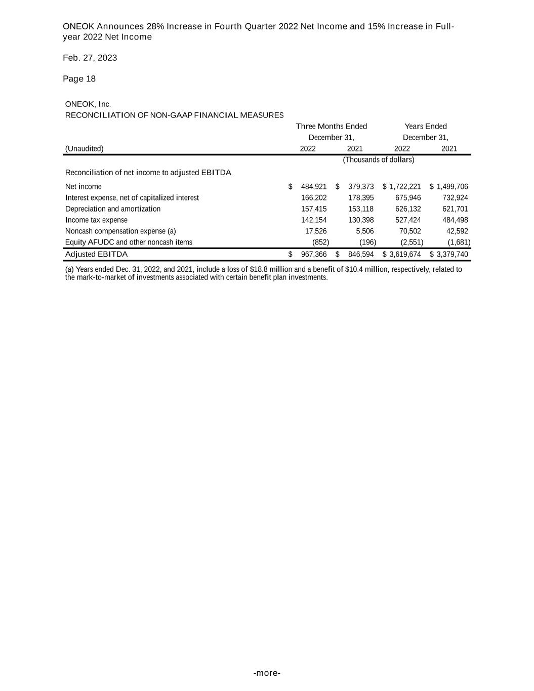 ONEOK Announces 28% Increase in Fourth Quarter 2022 Net Income and 15% Increase in Full- year 2022 Net Income Feb. 27, 2023 Page 18 -more- ONEOK, Inc. RECONCILIATION OF NON-GAAP FINANCIAL MEASURES Three Months Ended Years Ended December 31, December 31, (Unaudited) 2022 2021 2022 2021 (Thousands of dollars) Reconciliation of net income to adjusted EBITDA Net income $ 484,921 $ 379,373 $ 1,722,221 $ 1,499,706 Interest expense, net of capitalized interest 166,202 178,395 675,946 732,924 Depreciation and amortization 157,415 153,118 626,132 621,701 Income tax expense 142,154 130,398 527,424 484,498 Noncash compensation expense (a) 17,526 5,506 70,502 42,592 Equity AFUDC and other noncash items (852) (196) (2,551) (1,681) Adjusted EBITDA $ 967,366 $ 846,594 $ 3,619,674 $ 3,379,740 (a) Years ended Dec. 31, 2022, and 2021, include a loss of $18.8 million and a benefit of $10.4 million, respectively, related to the mark-to-market of investments associated with certain benefit plan investments.