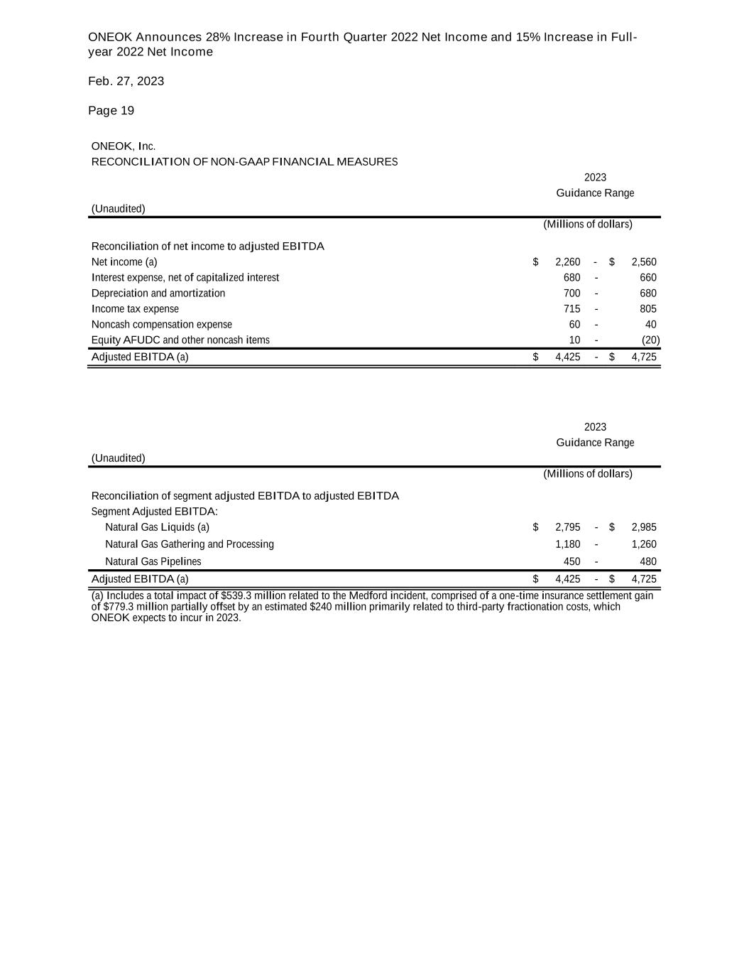 ONEOK Announces 28% Increase in Fourth Quarter 2022 Net Income and 15% Increase in Full- year 2022 Net Income Feb. 27, 2023 Page 19 ONEOK, Inc. RECONCILIATION OF NON-GAAP FINANCIAL MEASURES 2023 Guidance Range (Unaudited) (Millions of dollars) Reconciliation of net income to adjusted EBITDA Net income (a) $ 2,260 - $ 2,560 Interest expense, net of capitalized interest 680 - 660 Depreciation and amortization 700 - 680 Income tax expense 715 - 805 Noncash compensation expense 60 - 40 Equity AFUDC and other noncash items 10 - (20) Adjusted EBITDA (a) $ 4,425 - $ 4,725 2023 Guidance Range (Unaudited) (Millions of dollars) Reconciliation of segment adjusted EBITDA to adjusted EBITDA Segment Adjusted EBITDA: Natural Gas Liquids (a) $ 2,795 - $ 2,985 Natural Gas Gathering and Processing 1,180 - 1,260 Natural Gas Pipelines 450 - 480 Adjusted EBITDA (a) $ 4,425 - $ 4,725 (a) Includes a total impact of $539.3 million related to the Medford incident, comprised of a one-time insurance settlement gain of $779.3 million partially offset by an estimated $240 million primarily related to third-party fractionation costs, which ONEOK expects to incur in 2023.