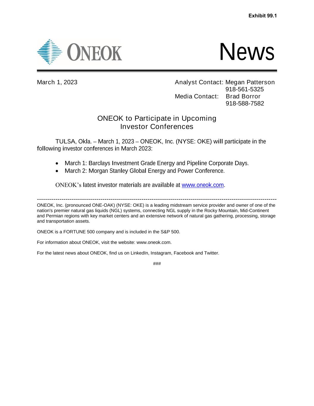 News ONEOK to Participate in Upcoming Investor Conferences TULSA, Okla. – March 1, 2023 – ONEOK, Inc. (NYSE: OKE) will participate in the following investor conferences in March 2023: • March 1: Barclays Investment Grade Energy and Pipeline Corporate Days. • March 2: Morgan Stanley Global Energy and Power Conference. ONEOK’s latest investor materials are available at www.oneok.com. --------------------------------------------------------------------------------------------------------------------- ONEOK, Inc. (pronounced ONE-OAK) (NYSE: OKE) is a leading midstream service provider and owner of one of the nation's premier natural gas liquids (NGL) systems, connecting NGL supply in the Rocky Mountain, Mid-Continent and Permian regions with key market centers and an extensive network of natural gas gathering, processing, storage and transportation assets. ONEOK is a FORTUNE 500 company and is included in the S&P 500. For information about ONEOK, visit the website: www.oneok.com. For the latest news about ONEOK, find us on LinkedIn, Instagram, Facebook and Twitter. ### March 1, 2023 Analyst Contact: Megan Patterson 918-561-5325 Media Contact: Brad Borror 918-588-7582 Exhibit 99.1
