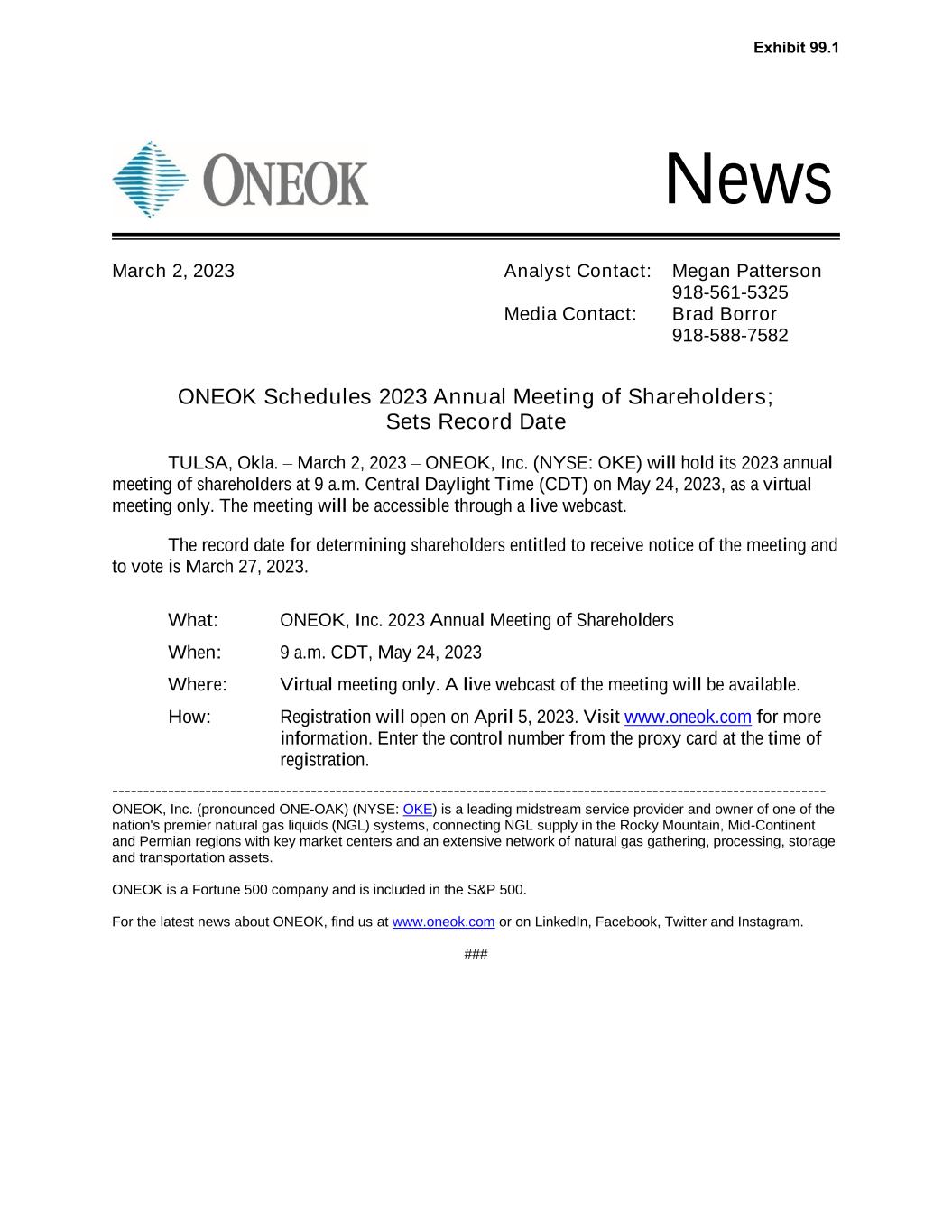 News ONEOK Schedules 2023 Annual Meeting of Shareholders; Sets Record Date TULSA, Okla. – March 2, 2023 – ONEOK, Inc. (NYSE: OKE) will hold its 2023 annual meeting of shareholders at 9 a.m. Central Daylight Time (CDT) on May 24, 2023, as a virtual meeting only. The meeting will be accessible through a live webcast. The record date for determining shareholders entitled to receive notice of the meeting and to vote is March 27, 2023. What: ONEOK, Inc. 2023 Annual Meeting of Shareholders When: 9 a.m. CDT, May 24, 2023 Where: Virtual meeting only. A live webcast of the meeting will be available. How: Registration will open on April 5, 2023. Visit www.oneok.com for more information. Enter the control number from the proxy card at the time of registration. ------------------------------------------------------------------------------------------------------------------- ONEOK, Inc. (pronounced ONE-OAK) (NYSE: OKE) is a leading midstream service provider and owner of one of the nation's premier natural gas liquids (NGL) systems, connecting NGL supply in the Rocky Mountain, Mid-Continent and Permian regions with key market centers and an extensive network of natural gas gathering, processing, storage and transportation assets. ONEOK is a Fortune 500 company and is included in the S&P 500. For the latest news about ONEOK, find us at www.oneok.com or on LinkedIn, Facebook, Twitter and Instagram. ### March 2, 2023 Analyst Contact: Megan Patterson 918-561-5325 Media Contact: Brad Borror 918-588-7582 Exhibit 99.1
