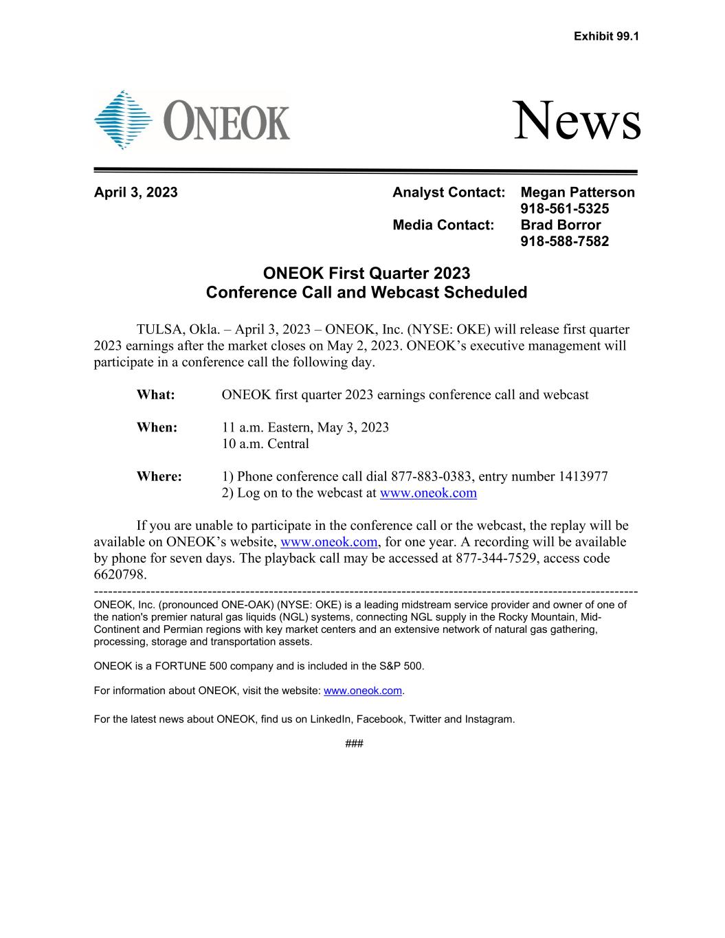 News ONEOK First Quarter 2023 Conference Call and Webcast Scheduled TULSA, Okla. – April 3, 2023 – ONEOK, Inc. (NYSE: OKE) will release first quarter 2023 earnings after the market closes on May 2, 2023. ONEOK’s executive management will participate in a conference call the following day. What: ONEOK first quarter 2023 earnings conference call and webcast When: 11 a.m. Eastern, May 3, 2023 10 a.m. Central Where: 1) Phone conference call dial 877-883-0383, entry number 1413977 2) Log on to the webcast at www.oneok.com If you are unable to participate in the conference call or the webcast, the replay will be available on ONEOK’s website, www.oneok.com, for one year. A recording will be available by phone for seven days. The playback call may be accessed at 877-344-7529, access code 6620798. ------------------------------------------------------------------------------------------------------------------- ONEOK, Inc. (pronounced ONE-OAK) (NYSE: OKE) is a leading midstream service provider and owner of one of the nation's premier natural gas liquids (NGL) systems, connecting NGL supply in the Rocky Mountain, Mid- Continent and Permian regions with key market centers and an extensive network of natural gas gathering, processing, storage and transportation assets. ONEOK is a FORTUNE 500 company and is included in the S&P 500. For information about ONEOK, visit the website: www.oneok.com. For the latest news about ONEOK, find us on LinkedIn, Facebook, Twitter and Instagram. ### April 3, 2023 Analyst Contact: Megan Patterson 918-561-5325 Media Contact: Brad Borror 918-588-7582 Exhibit 99.1