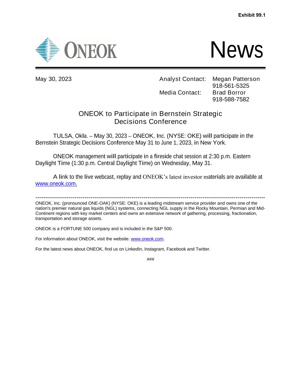 News ONEOK to Participate in Bernstein Strategic Decisions Conference TULSA, Okla. – May 30, 2023 – ONEOK, Inc. (NYSE: OKE) will participate in the Bernstein Strategic Decisions Conference May 31 to June 1, 2023, in New York. ONEOK management will participate in a fireside chat session at 2:30 p.m. Eastern Daylight Time (1:30 p.m. Central Daylight Time) on Wednesday, May 31. A link to the live webcast, replay and ONEOK’s latest investor materials are available at www.oneok.com. --------------------------------------------------------------------------------------------------------------------- ONEOK, Inc. (pronounced ONE-OAK) (NYSE: OKE) is a leading midstream service provider and owns one of the nation's premier natural gas liquids (NGL) systems, connecting NGL supply in the Rocky Mountain, Permian and Mid- Continent regions with key market centers and owns an extensive network of gathering, processing, fractionation, transportation and storage assets. ONEOK is a FORTUNE 500 company and is included in the S&P 500. For information about ONEOK, visit the website: www.oneok.com. For the latest news about ONEOK, find us on LinkedIn, Instagram, Facebook and Twitter. ### May 30, 2023 Analyst Contact: Megan Patterson 918-561-5325 Media Contact: Brad Borror 918-588-7582 Exhibit 99.1
