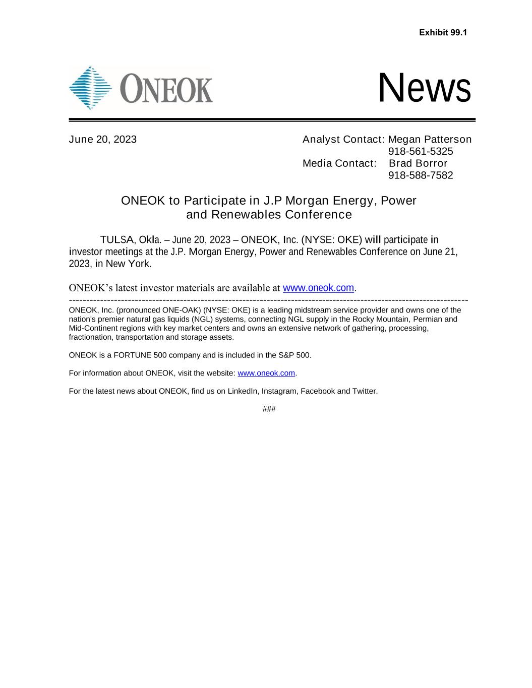 News ONEOK to Participate in J.P Morgan Energy, Power and Renewables Conference TULSA, Okla. – June 20, 2023 – ONEOK, Inc. (NYSE: OKE) will participate in investor meetings at the J.P. Morgan Energy, Power and Renewables Conference on June 21, 2023, in New York. ONEOK’s latest investor materials are available at www.oneok.com. ------------------------------------------------------------------------------------------------------------------- ONEOK, Inc. (pronounced ONE-OAK) (NYSE: OKE) is a leading midstream service provider and owns one of the nation's premier natural gas liquids (NGL) systems, connecting NGL supply in the Rocky Mountain, Permian and Mid-Continent regions with key market centers and owns an extensive network of gathering, processing, fractionation, transportation and storage assets. ONEOK is a FORTUNE 500 company and is included in the S&P 500. For information about ONEOK, visit the website: www.oneok.com. For the latest news about ONEOK, find us on LinkedIn, Instagram, Facebook and Twitter. ### June 20, 2023 Analyst Contact: Megan Patterson 918-561-5325 Media Contact: Brad Borror 918-588-7582 Exhibit 99.1