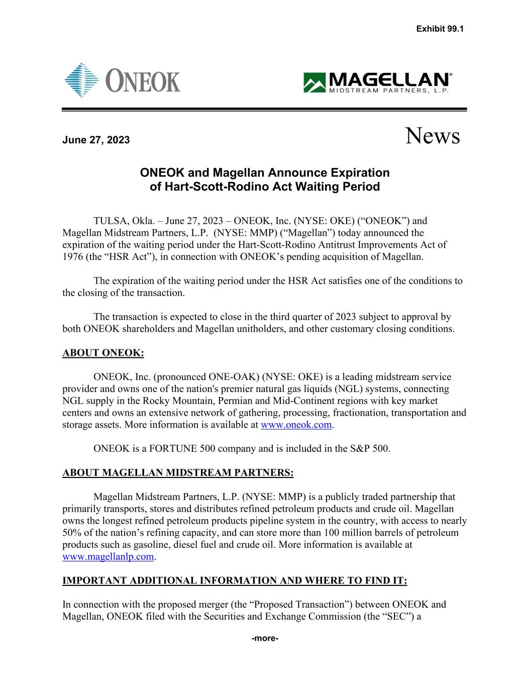 -more- ONEOK and Magellan Announce Expiration of Hart-Scott-Rodino Act Waiting Period TULSA, Okla. – June 27, 2023 – ONEOK, Inc. (NYSE: OKE) (“ONEOK”) and Magellan Midstream Partners, L.P. (NYSE: MMP) (“Magellan”) today announced the expiration of the waiting period under the Hart-Scott-Rodino Antitrust Improvements Act of 1976 (the “HSR Act”), in connection with ONEOK’s pending acquisition of Magellan. The expiration of the waiting period under the HSR Act satisfies one of the conditions to the closing of the transaction. The transaction is expected to close in the third quarter of 2023 subject to approval by both ONEOK shareholders and Magellan unitholders, and other customary closing conditions. ABOUT ONEOK: ONEOK, Inc. (pronounced ONE-OAK) (NYSE: OKE) is a leading midstream service provider and owns one of the nation's premier natural gas liquids (NGL) systems, connecting NGL supply in the Rocky Mountain, Permian and Mid-Continent regions with key market centers and owns an extensive network of gathering, processing, fractionation, transportation and storage assets. More information is available at www.oneok.com. ONEOK is a FORTUNE 500 company and is included in the S&P 500. ABOUT MAGELLAN MIDSTREAM PARTNERS: Magellan Midstream Partners, L.P. (NYSE: MMP) is a publicly traded partnership that primarily transports, stores and distributes refined petroleum products and crude oil. Magellan owns the longest refined petroleum products pipeline system in the country, with access to nearly 50% of the nation’s refining capacity, and can store more than 100 million barrels of petroleum products such as gasoline, diesel fuel and crude oil. More information is available at www.magellanlp.com. IMPORTANT ADDITIONAL INFORMATION AND WHERE TO FIND IT: In connection with the proposed merger (the “Proposed Transaction”) between ONEOK and Magellan, ONEOK filed with the Securities and Exchange Commission (the “SEC”) a June 27, 2023 News Exhibit 99.1