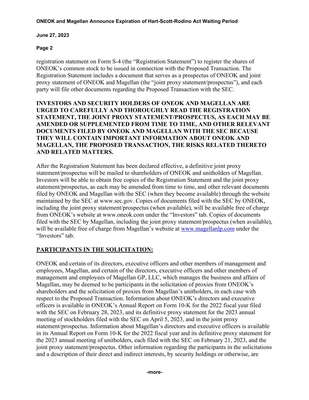 ONEOK and Magellan Announce Expiration of Hart-Scott-Rodino Act Waiting Period June 27, 2023 Page 2 -more- registration statement on Form S-4 (the “Registration Statement”) to register the shares of ONEOK’s common stock to be issued in connection with the Proposed Transaction. The Registration Statement includes a document that serves as a prospectus of ONEOK and joint proxy statement of ONEOK and Magellan (the “joint proxy statement/prospectus”), and each party will file other documents regarding the Proposed Transaction with the SEC. INVESTORS AND SECURITY HOLDERS OF ONEOK AND MAGELLAN ARE URGED TO CAREFULLY AND THOROUGHLY READ THE REGISTRATION STATEMENT, THE JOINT PROXY STATEMENT/PROSPECTUS, AS EACH MAY BE AMENDED OR SUPPLEMENTED FROM TIME TO TIME, AND OTHER RELEVANT DOCUMENTS FILED BY ONEOK AND MAGELLAN WITH THE SEC BECAUSE THEY WILL CONTAIN IMPORTANT INFORMATION ABOUT ONEOK AND MAGELLAN, THE PROPOSED TRANSACTION, THE RISKS RELATED THERETO AND RELATED MATTERS. After the Registration Statement has been declared effective, a definitive joint proxy statement/prospectus will be mailed to shareholders of ONEOK and unitholders of Magellan. Investors will be able to obtain free copies of the Registration Statement and the joint proxy statement/prospectus, as each may be amended from time to time, and other relevant documents filed by ONEOK and Magellan with the SEC (when they become available) through the website maintained by the SEC at www.sec.gov. Copies of documents filed with the SEC by ONEOK, including the joint proxy statement/prospectus (when available), will be available free of charge from ONEOK’s website at www.oneok.com under the “Investors” tab. Copies of documents filed with the SEC by Magellan, including the joint proxy statement/prospectus (when available), will be available free of charge from Magellan’s website at www.magellanlp.com under the “Investors” tab. PARTICIPANTS IN THE SOLICITATION: ONEOK and certain of its directors, executive officers and other members of management and employees, Magellan, and certain of the directors, executive officers and other members of management and employees of Magellan GP, LLC, which manages the business and affairs of Magellan, may be deemed to be participants in the solicitation of proxies from ONEOK’s shareholders and the solicitation of proxies from Magellan’s unitholders, in each case with respect to the Proposed Transaction. Information about ONEOK’s directors and executive officers is available in ONEOK’s Annual Report on Form 10-K for the 2022 fiscal year filed with the SEC on February 28, 2023, and its definitive proxy statement for the 2023 annual meeting of stockholders filed with the SEC on April 5, 2023, and in the joint proxy statement/prospectus. Information about Magellan’s directors and executive officers is available in its Annual Report on Form 10-K for the 2022 fiscal year and its definitive proxy statement for the 2023 annual meeting of unitholders, each filed with the SEC on February 21, 2023, and the joint proxy statement/prospectus. Other information regarding the participants in the solicitations and a description of their direct and indirect interests, by security holdings or otherwise, are