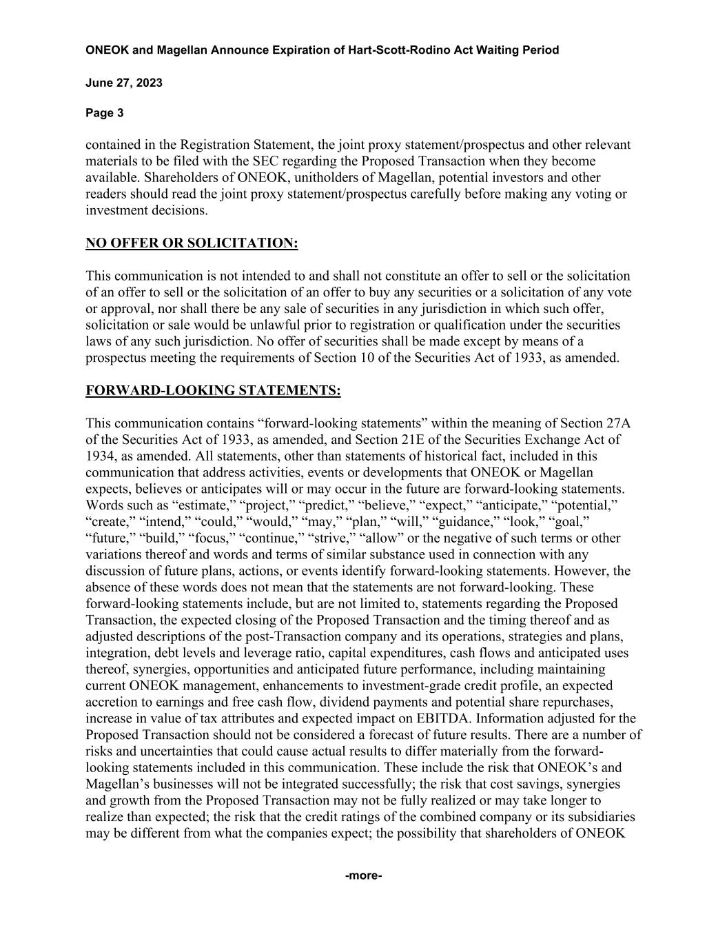 ONEOK and Magellan Announce Expiration of Hart-Scott-Rodino Act Waiting Period June 27, 2023 Page 3 -more- contained in the Registration Statement, the joint proxy statement/prospectus and other relevant materials to be filed with the SEC regarding the Proposed Transaction when they become available. Shareholders of ONEOK, unitholders of Magellan, potential investors and other readers should read the joint proxy statement/prospectus carefully before making any voting or investment decisions. NO OFFER OR SOLICITATION: This communication is not intended to and shall not constitute an offer to sell or the solicitation of an offer to sell or the solicitation of an offer to buy any securities or a solicitation of any vote or approval, nor shall there be any sale of securities in any jurisdiction in which such offer, solicitation or sale would be unlawful prior to registration or qualification under the securities laws of any such jurisdiction. No offer of securities shall be made except by means of a prospectus meeting the requirements of Section 10 of the Securities Act of 1933, as amended. FORWARD-LOOKING STATEMENTS: This communication contains “forward-looking statements” within the meaning of Section 27A of the Securities Act of 1933, as amended, and Section 21E of the Securities Exchange Act of 1934, as amended. All statements, other than statements of historical fact, included in this communication that address activities, events or developments that ONEOK or Magellan expects, believes or anticipates will or may occur in the future are forward-looking statements. Words such as “estimate,” “project,” “predict,” “believe,” “expect,” “anticipate,” “potential,” “create,” “intend,” “could,” “would,” “may,” “plan,” “will,” “guidance,” “look,” “goal,” “future,” “build,” “focus,” “continue,” “strive,” “allow” or the negative of such terms or other variations thereof and words and terms of similar substance used in connection with any discussion of future plans, actions, or events identify forward-looking statements. However, the absence of these words does not mean that the statements are not forward-looking. These forward-looking statements include, but are not limited to, statements regarding the Proposed Transaction, the expected closing of the Proposed Transaction and the timing thereof and as adjusted descriptions of the post-Transaction company and its operations, strategies and plans, integration, debt levels and leverage ratio, capital expenditures, cash flows and anticipated uses thereof, synergies, opportunities and anticipated future performance, including maintaining current ONEOK management, enhancements to investment-grade credit profile, an expected accretion to earnings and free cash flow, dividend payments and potential share repurchases, increase in value of tax attributes and expected impact on EBITDA. Information adjusted for the Proposed Transaction should not be considered a forecast of future results. There are a number of risks and uncertainties that could cause actual results to differ materially from the forward- looking statements included in this communication. These include the risk that ONEOK’s and Magellan’s businesses will not be integrated successfully; the risk that cost savings, synergies and growth from the Proposed Transaction may not be fully realized or may take longer to realize than expected; the risk that the credit ratings of the combined company or its subsidiaries may be different from what the companies expect; the possibility that shareholders of ONEOK