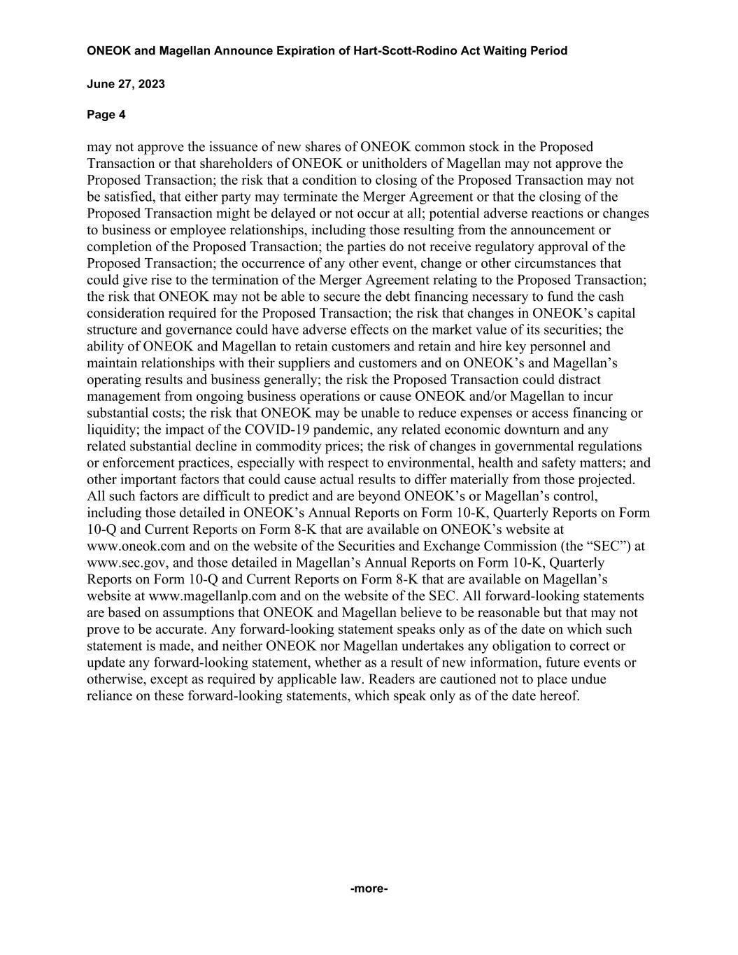 ONEOK and Magellan Announce Expiration of Hart-Scott-Rodino Act Waiting Period June 27, 2023 Page 4 -more- may not approve the issuance of new shares of ONEOK common stock in the Proposed Transaction or that shareholders of ONEOK or unitholders of Magellan may not approve the Proposed Transaction; the risk that a condition to closing of the Proposed Transaction may not be satisfied, that either party may terminate the Merger Agreement or that the closing of the Proposed Transaction might be delayed or not occur at all; potential adverse reactions or changes to business or employee relationships, including those resulting from the announcement or completion of the Proposed Transaction; the parties do not receive regulatory approval of the Proposed Transaction; the occurrence of any other event, change or other circumstances that could give rise to the termination of the Merger Agreement relating to the Proposed Transaction; the risk that ONEOK may not be able to secure the debt financing necessary to fund the cash consideration required for the Proposed Transaction; the risk that changes in ONEOK’s capital structure and governance could have adverse effects on the market value of its securities; the ability of ONEOK and Magellan to retain customers and retain and hire key personnel and maintain relationships with their suppliers and customers and on ONEOK’s and Magellan’s operating results and business generally; the risk the Proposed Transaction could distract management from ongoing business operations or cause ONEOK and/or Magellan to incur substantial costs; the risk that ONEOK may be unable to reduce expenses or access financing or liquidity; the impact of the COVID-19 pandemic, any related economic downturn and any related substantial decline in commodity prices; the risk of changes in governmental regulations or enforcement practices, especially with respect to environmental, health and safety matters; and other important factors that could cause actual results to differ materially from those projected. All such factors are difficult to predict and are beyond ONEOK’s or Magellan’s control, including those detailed in ONEOK’s Annual Reports on Form 10-K, Quarterly Reports on Form 10-Q and Current Reports on Form 8-K that are available on ONEOK’s website at www.oneok.com and on the website of the Securities and Exchange Commission (the “SEC”) at www.sec.gov, and those detailed in Magellan’s Annual Reports on Form 10-K, Quarterly Reports on Form 10-Q and Current Reports on Form 8-K that are available on Magellan’s website at www.magellanlp.com and on the website of the SEC. All forward-looking statements are based on assumptions that ONEOK and Magellan believe to be reasonable but that may not prove to be accurate. Any forward-looking statement speaks only as of the date on which such statement is made, and neither ONEOK nor Magellan undertakes any obligation to correct or update any forward-looking statement, whether as a result of new information, future events or otherwise, except as required by applicable law. Readers are cautioned not to place undue reliance on these forward-looking statements, which speak only as of the date hereof.