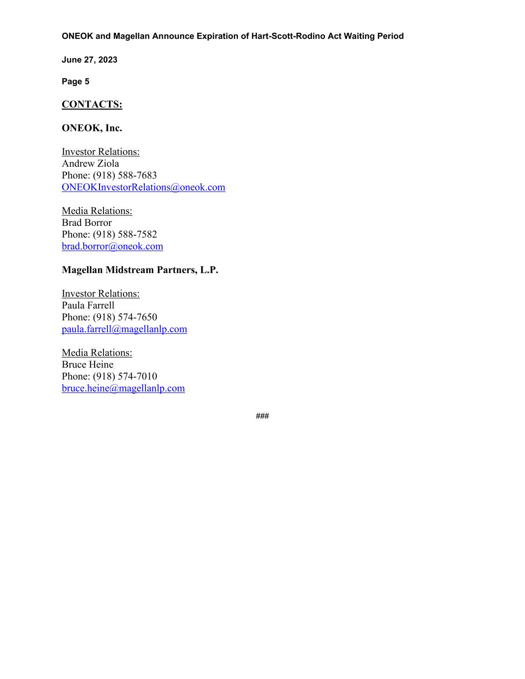 ONEOK and Magellan Announce Expiration of Hart-Scott-Rodino Act Waiting Period June 27, 2023 Page 5 -more- CONTACTS: ONEOK, Inc. Investor Relations: Andrew Ziola Phone: (918) 588-7683 ONEOKInvestorRelations@oneok.com Media Relations: Brad Borror Phone: (918) 588-7582 brad.borror@oneok.com Magellan Midstream Partners, L.P. Investor Relations: Paula Farrell Phone: (918) 574-7650 paula.farrell@magellanlp.com Media Relations: Bruce Heine Phone: (918) 574-7010 bruce.heine@magellanlp.com ###
