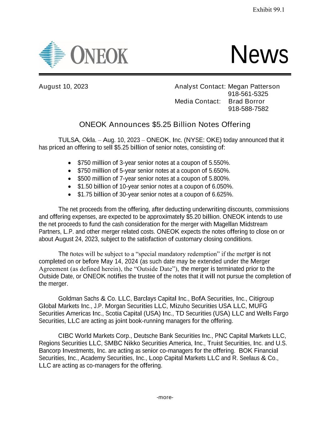 -more- News ONEOK Announces $5.25 Billion Notes Offering TULSA, Okla. – Aug. 10, 2023 – ONEOK, Inc. (NYSE: OKE) today announced that it has priced an offering to sell $5.25 billion of senior notes, consisting of: • $750 million of 3-year senior notes at a coupon of 5.550%. • $750 million of 5-year senior notes at a coupon of 5.650%. • $500 million of 7-year senior notes at a coupon of 5.800%. • $1.50 billion of 10-year senior notes at a coupon of 6.050%. • $1.75 billion of 30-year senior notes at a coupon of 6.625%. The net proceeds from the offering, after deducting underwriting discounts, commissions and offering expenses, are expected to be approximately $5.20 billion. ONEOK intends to use the net proceeds to fund the cash consideration for the merger with Magellan Midstream Partners, L.P. and other merger related costs. ONEOK expects the notes offering to close on or about August 24, 2023, subject to the satisfaction of customary closing conditions. The notes will be subject to a “special mandatory redemption” if the merger is not completed on or before May 14, 2024 (as such date may be extended under the Merger Agreement (as defined herein), the “Outside Date”), the merger is terminated prior to the Outside Date, or ONEOK notifies the trustee of the notes that it will not pursue the completion of the merger. Goldman Sachs & Co. LLC, Barclays Capital Inc., BofA Securities, Inc., Citigroup Global Markets Inc., J.P. Morgan Securities LLC, Mizuho Securities USA LLC, MUFG Securities Americas Inc., Scotia Capital (USA) Inc., TD Securities (USA) LLC and Wells Fargo Securities, LLC are acting as joint book-running managers for the offering. CIBC World Markets Corp., Deutsche Bank Securities Inc., PNC Capital Markets LLC, Regions Securities LLC, SMBC Nikko Securities America, Inc., Truist Securities, Inc. and U.S. Bancorp Investments, Inc. are acting as senior co-managers for the offering. BOK Financial Securities, Inc., Academy Securities, Inc., Loop Capital Markets LLC and R. Seelaus & Co., LLC are acting as co-managers for the offering. August 10, 2023 Analyst Contact: Megan Patterson 918-561-5325 Media Contact: Brad Borror 918-588-7582 Exhibit 99.1