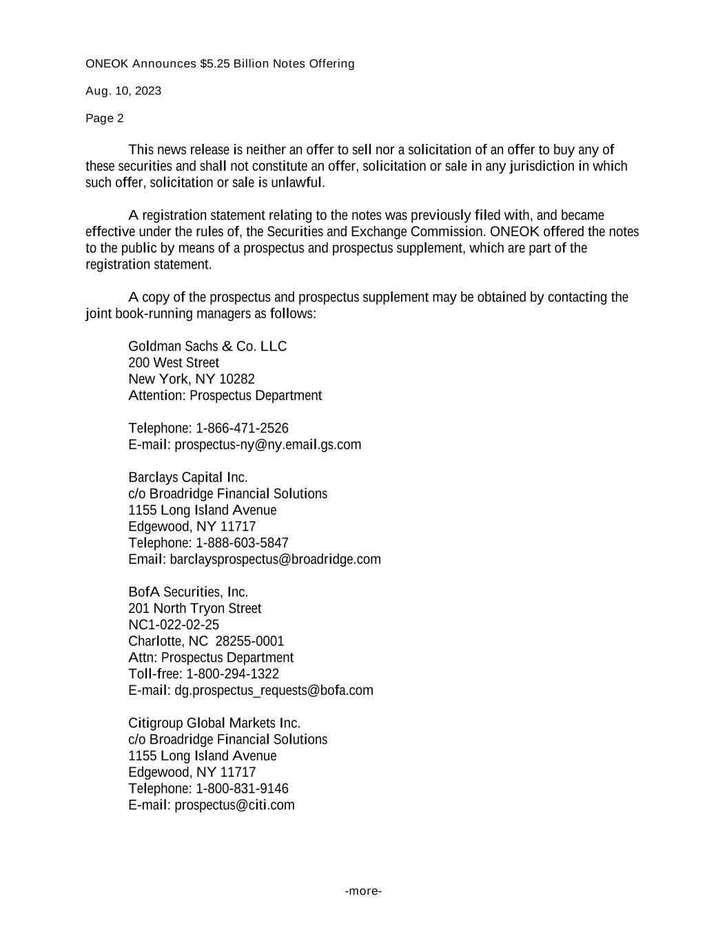 ONEOK Announces $5.25 Billion Notes Offering Aug. 10, 2023 Page 2 -more- This news release is neither an offer to sell nor a solicitation of an offer to buy any of these securities and shall not constitute an offer, solicitation or sale in any jurisdiction in which such offer, solicitation or sale is unlawful. A registration statement relating to the notes was previously filed with, and became effective under the rules of, the Securities and Exchange Commission. ONEOK offered the notes to the public by means of a prospectus and prospectus supplement, which are part of the registration statement. A copy of the prospectus and prospectus supplement may be obtained by contacting the joint book-running managers as follows: Goldman Sachs & Co. LLC 200 West Street New York, NY 10282 Attention: Prospectus Department Telephone: 1-866-471-2526 E-mail: prospectus-ny@ny.email.gs.com Barclays Capital Inc. c/o Broadridge Financial Solutions 1155 Long Island Avenue Edgewood, NY 11717 Telephone: 1-888-603-5847 Email: barclaysprospectus@broadridge.com BofA Securities, Inc. 201 North Tryon Street NC1-022-02-25 Charlotte, NC 28255-0001 Attn: Prospectus Department Toll-free: 1-800-294-1322 E-mail: dg.prospectus_requests@bofa.com Citigroup Global Markets Inc. c/o Broadridge Financial Solutions 1155 Long Island Avenue Edgewood, NY 11717 Telephone: 1-800-831-9146 E-mail: prospectus@citi.com