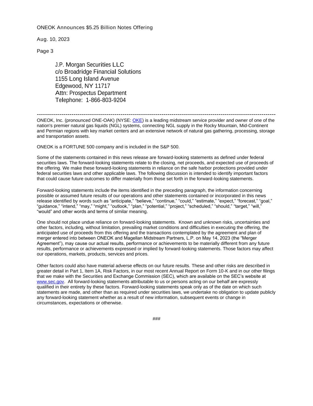 ONEOK Announces $5.25 Billion Notes Offering Aug. 10, 2023 Page 3 -more- J.P. Morgan Securities LLC c/o Broadridge Financial Solutions 1155 Long Island Avenue Edgewood, NY 11717 Attn: Prospectus Department Telephone: 1-866-803-9204 --------------------------------------------------------------------------------------------------------------------- ONEOK, Inc. (pronounced ONE-OAK) (NYSE: OKE) is a leading midstream service provider and owner of one of the nation's premier natural gas liquids (NGL) systems, connecting NGL supply in the Rocky Mountain, Mid-Continent and Permian regions with key market centers and an extensive network of natural gas gathering, processing, storage and transportation assets. ONEOK is a FORTUNE 500 company and is included in the S&P 500. Some of the statements contained in this news release are forward-looking statements as defined under federal securities laws. The forward-looking statements relate to the closing, net proceeds, and expected use of proceeds of the offering. We make these forward-looking statements in reliance on the safe harbor protections provided under federal securities laws and other applicable laws. The following discussion is intended to identify important factors that could cause future outcomes to differ materially from those set forth in the forward-looking statements. Forward-looking statements include the items identified in the preceding paragraph, the information concerning possible or assumed future results of our operations and other statements contained or incorporated in this news release identified by words such as “anticipate,” “believe,” “continue,” “could,” “estimate,” “expect,” “forecast,” “goal,” “guidance,” “intend,” “may,” “might,” “outlook,” “plan,” “potential,” “project,” “scheduled,” “should,” “target,” “will,” “would” and other words and terms of similar meaning. One should not place undue reliance on forward-looking statements. Known and unknown risks, uncertainties and other factors, including, without limitation, prevailing market conditions and difficulties in executing the offering, the anticipated use of proceeds from this offering and the transactions contemplated by the agreement and plan of merger entered into between ONEOK and Magellan Midstream Partners, L.P. on May 14, 2023 (the “Merger Agreement”), may cause our actual results, performance or achievements to be materially different from any future results, performance or achievements expressed or implied by forward-looking statements. Those factors may affect our operations, markets, products, services and prices. Other factors could also have material adverse effects on our future results. These and other risks are described in greater detail in Part 1, Item 1A, Risk Factors, in our most recent Annual Report on Form 10-K and in our other filings that we make with the Securities and Exchange Commission (SEC), which are available on the SEC’s website at www.sec.gov. All forward-looking statements attributable to us or persons acting on our behalf are expressly qualified in their entirety by these factors. Forward-looking statements speak only as of the date on which such statements are made, and other than as required under securities laws, we undertake no obligation to update publicly any forward-looking statement whether as a result of new information, subsequent events or change in circumstances, expectations or otherwise. ###