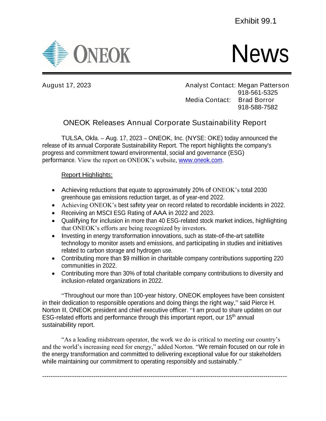 News ONEOK Releases Annual Corporate Sustainability Report TULSA, Okla. – Aug. 17, 2023 – ONEOK, Inc. (NYSE: OKE) today announced the release of its annual Corporate Sustainability Report. The report highlights the company's progress and commitment toward environmental, social and governance (ESG) performance. View the report on ONEOK’s website, www.oneok.com. Report Highlights: • Achieving reductions that equate to approximately 20% of ONEOK’s total 2030 greenhouse gas emissions reduction target, as of year-end 2022. • Achieving ONEOK’s best safety year on record related to recordable incidents in 2022. • Receiving an MSCI ESG Rating of AAA in 2022 and 2023. • Qualifying for inclusion in more than 40 ESG-related stock market indices, highlighting that ONEOK’s efforts are being recognized by investors. • Investing in energy transformation innovations, such as state-of-the-art satellite technology to monitor assets and emissions, and participating in studies and initiatives related to carbon storage and hydrogen use. • Contributing more than $9 million in charitable company contributions supporting 220 communities in 2022. • Contributing more than 30% of total charitable company contributions to diversity and inclusion-related organizations in 2022. “Throughout our more than 100-year history, ONEOK employees have been consistent in their dedication to responsible operations and doing things the right way,” said Pierce H. Norton II, ONEOK president and chief executive officer. “I am proud to share updates on our ESG-related efforts and performance through this important report, our 15th annual sustainability report. “As a leading midstream operator, the work we do is critical to meeting our country’s and the world’s increasing need for energy,” added Norton. “We remain focused on our role in the energy transformation and committed to delivering exceptional value for our stakeholders while maintaining our commitment to operating responsibly and sustainably.” ------------------------------------------------------------------------------------------------------------------- August 17, 2023 Analyst Contact: Megan Patterson 918-561-5325 Media Contact: Brad Borror 918-588-7582