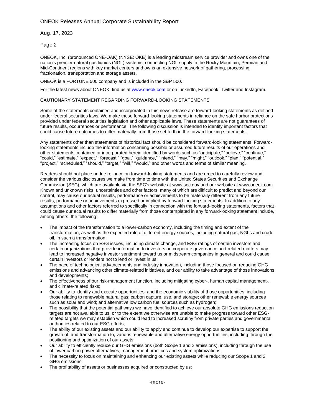 ONEOK Releases Annual Corporate Sustainability Report Aug. 17, 2023 Page 2 -more- ONEOK, Inc. (pronounced ONE-OAK) (NYSE: OKE) is a leading midstream service provider and owns one of the nation's premier natural gas liquids (NGL) systems, connecting NGL supply in the Rocky Mountain, Permian and Mid-Continent regions with key market centers and owns an extensive network of gathering, processing, fractionation, transportation and storage assets. ONEOK is a FORTUNE 500 company and is included in the S&P 500. For the latest news about ONEOK, find us at www.oneok.com or on LinkedIn, Facebook, Twitter and Instagram. CAUTIONARY STATEMENT REGARDING FORWARD-LOOKING STATEMENTS Some of the statements contained and incorporated in this news release are forward-looking statements as defined under federal securities laws. We make these forward-looking statements in reliance on the safe harbor protections provided under federal securities legislation and other applicable laws. These statements are not guarantees of future results, occurrences or performance. The following discussion is intended to identify important factors that could cause future outcomes to differ materially from those set forth in the forward-looking statements. Any statements other than statements of historical fact should be considered forward-looking statements. Forward- looking statements include the information concerning possible or assumed future results of our operations and other statements contained or incorporated herein identified by words such as “anticipate,” “believe,” “continue,” “could,” “estimate,” “expect,” “forecast,” “goal,” “guidance,” “intend,” “may,” “might,” “outlook,” “plan,” “potential,” “project,” “scheduled,” “should,” “target,” “will,” “would,” and other words and terms of similar meaning. Readers should not place undue reliance on forward-looking statements and are urged to carefully review and consider the various disclosures we make from time to time with the United States Securities and Exchange Commission (SEC), which are available via the SEC's website at www.sec.gov and our website at www.oneok.com. Known and unknown risks, uncertainties and other factors, many of which are difficult to predict and beyond our control, may cause our actual results, performance or achievements to be materially different from any future results, performance or achievements expressed or implied by forward-looking statements. In addition to any assumptions and other factors referred to specifically in connection with the forward-looking statements, factors that could cause our actual results to differ materially from those contemplated in any forward-looking statement include, among others, the following: • The impact of the transformation to a lower-carbon economy, including the timing and extent of the transformation, as well as the expected role of different energy sources, including natural gas, NGLs and crude oil, in such a transformation; • The increasing focus on ESG issues, including climate change, and ESG ratings of certain investors and certain organizations that provide information to investors on corporate governance and related matters may lead to increased negative investor sentiment toward us or midstream companies in general and could cause certain investors or lenders not to lend or invest in us; • The pace of technological advancements and industry innovation, including those focused on reducing GHG emissions and advancing other climate-related initiatives, and our ability to take advantage of those innovations and developments; • The effectiveness of our risk-management function, including mitigating cyber-, human capital management-, and climate-related risks; • Our ability to identify and execute opportunities, and the economic viability of those opportunities, including those relating to renewable natural gas; carbon capture, use, and storage; other renewable energy sources such as solar and wind; and alternative low carbon fuel sources such as hydrogen; • The possibility that the potential pathways we have identified to achieve our absolute GHG emissions reduction targets are not available to us, or to the extent we otherwise are unable to make progress toward other ESG- related targets we may establish which could lead to increased scrutiny from private parties and governmental authorities related to our ESG efforts; • The ability of our existing assets and our ability to apply and continue to develop our expertise to support the growth of, and transformation to, various renewable and alternative energy opportunities, including through the positioning and optimization of our assets; • Our ability to efficiently reduce our GHG emissions (both Scope 1 and 2 emissions), including through the use of lower carbon power alternatives, management practices and system optimizations; • The necessity to focus on maintaining and enhancing our existing assets while reducing our Scope 1 and 2 GHG emissions; • The profitability of assets or businesses acquired or constructed by us;