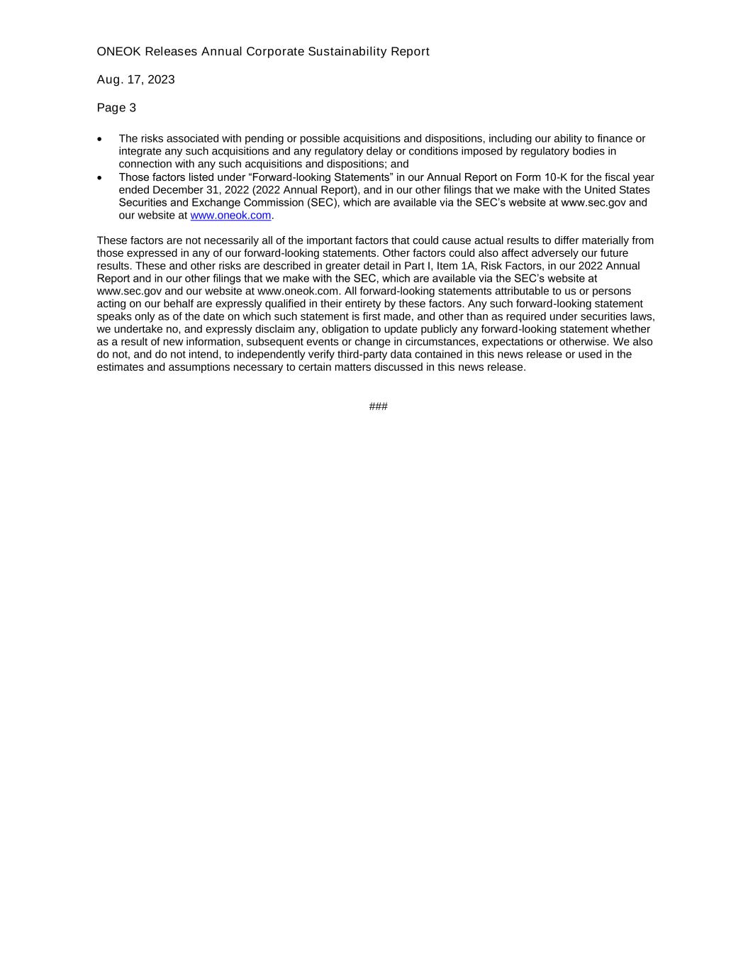 ONEOK Releases Annual Corporate Sustainability Report Aug. 17, 2023 Page 3 -more- • The risks associated with pending or possible acquisitions and dispositions, including our ability to finance or integrate any such acquisitions and any regulatory delay or conditions imposed by regulatory bodies in connection with any such acquisitions and dispositions; and • Those factors listed under “Forward-looking Statements” in our Annual Report on Form 10-K for the fiscal year ended December 31, 2022 (2022 Annual Report), and in our other filings that we make with the United States Securities and Exchange Commission (SEC), which are available via the SEC’s website at www.sec.gov and our website at www.oneok.com. These factors are not necessarily all of the important factors that could cause actual results to differ materially from those expressed in any of our forward-looking statements. Other factors could also affect adversely our future results. These and other risks are described in greater detail in Part I, Item 1A, Risk Factors, in our 2022 Annual Report and in our other filings that we make with the SEC, which are available via the SEC’s website at www.sec.gov and our website at www.oneok.com. All forward-looking statements attributable to us or persons acting on our behalf are expressly qualified in their entirety by these factors. Any such forward-looking statement speaks only as of the date on which such statement is first made, and other than as required under securities laws, we undertake no, and expressly disclaim any, obligation to update publicly any forward-looking statement whether as a result of new information, subsequent events or change in circumstances, expectations or otherwise. We also do not, and do not intend, to independently verify third-party data contained in this news release or used in the estimates and assumptions necessary to certain matters discussed in this news release. ###