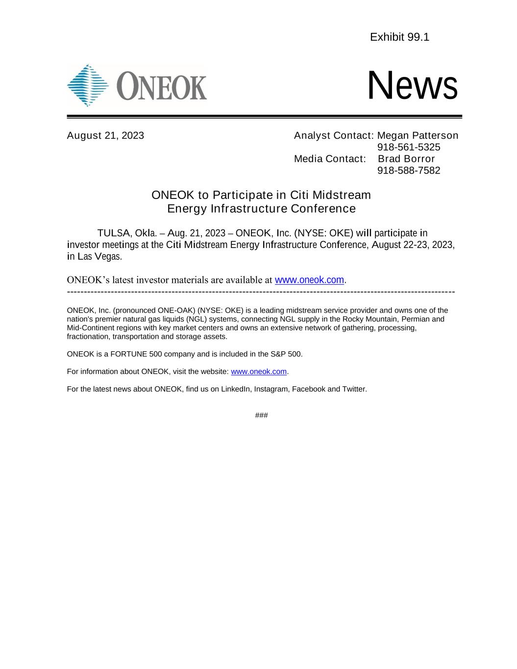News ONEOK to Participate in Citi Midstream Energy Infrastructure Conference TULSA, Okla. – Aug. 21, 2023 – ONEOK, Inc. (NYSE: OKE) will participate in investor meetings at the Citi Midstream Energy Infrastructure Conference, August 22-23, 2023, in Las Vegas. ONEOK’s latest investor materials are available at www.oneok.com. ------------------------------------------------------------------------------------------------------------------- ONEOK, Inc. (pronounced ONE-OAK) (NYSE: OKE) is a leading midstream service provider and owns one of the nation's premier natural gas liquids (NGL) systems, connecting NGL supply in the Rocky Mountain, Permian and Mid-Continent regions with key market centers and owns an extensive network of gathering, processing, fractionation, transportation and storage assets. ONEOK is a FORTUNE 500 company and is included in the S&P 500. For information about ONEOK, visit the website: www.oneok.com. For the latest news about ONEOK, find us on LinkedIn, Instagram, Facebook and Twitter. ### August 21, 2023 Analyst Contact: Megan Patterson 918-561-5325 Media Contact: Brad Borror 918-588-7582