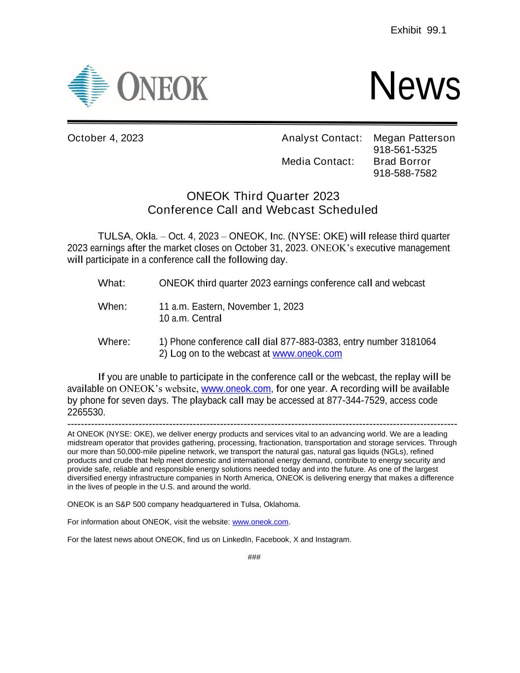 News ONEOK Third Quarter 2023 Conference Call and Webcast Scheduled TULSA, Okla. – Oct. 4, 2023 – ONEOK, Inc. (NYSE: OKE) will release third quarter 2023 earnings after the market closes on October 31, 2023. ONEOK’s executive management will participate in a conference call the following day. What: ONEOK third quarter 2023 earnings conference call and webcast When: 11 a.m. Eastern, November 1, 2023 10 a.m. Central Where: 1) Phone conference call dial 877-883-0383, entry number 3181064 2) Log on to the webcast at www.oneok.com If you are unable to participate in the conference call or the webcast, the replay will be available on ONEOK’s website, www.oneok.com, for one year. A recording will be available by phone for seven days. The playback call may be accessed at 877-344-7529, access code 2265530. ------------------------------------------------------------------------------------------------------------------- At ONEOK (NYSE: OKE), we deliver energy products and services vital to an advancing world. We are a leading midstream operator that provides gathering, processing, fractionation, transportation and storage services. Through our more than 50,000-mile pipeline network, we transport the natural gas, natural gas liquids (NGLs), refined products and crude that help meet domestic and international energy demand, contribute to energy security and provide safe, reliable and responsible energy solutions needed today and into the future. As one of the largest diversified energy infrastructure companies in North America, ONEOK is delivering energy that makes a difference in the lives of people in the U.S. and around the world. ONEOK is an S&P 500 company headquartered in Tulsa, Oklahoma. For information about ONEOK, visit the website: www.oneok.com. For the latest news about ONEOK, find us on LinkedIn, Facebook, X and Instagram. ### October 4, 2023 Analyst Contact: Megan Patterson 918-561-5325 Media Contact: Brad Borror 918-588-7582