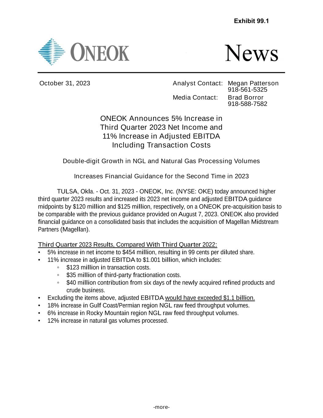 -more- October 31, 2023 Analyst Contact: Megan Patterson 918-561-5325 Media Contact: Brad Borror 918-588-7582 ONEOK Announces 5% Increase in Third Quarter 2023 Net Income and 11% Increase in Adjusted EBITDA Including Transaction Costs Double-digit Growth in NGL and Natural Gas Processing Volumes Increases Financial Guidance for the Second Time in 2023 TULSA, Okla. - Oct. 31, 2023 - ONEOK, Inc. (NYSE: OKE) today announced higher third quarter 2023 results and increased its 2023 net income and adjusted EBITDA guidance midpoints by $120 million and $125 million, respectively, on a ONEOK pre-acquisition basis to be comparable with the previous guidance provided on August 7, 2023. ONEOK also provided financial guidance on a consolidated basis that includes the acquisition of Magellan Midstream Partners (Magellan). Third Quarter 2023 Results, Compared With Third Quarter 2022: • 5% increase in net income to $454 million, resulting in 99 cents per diluted share. • 11% increase in adjusted EBITDA to $1.001 billion, which includes: ◦ $123 million in transaction costs. ◦ $35 million of third-party fractionation costs. ◦ $40 million contribution from six days of the newly acquired refined products and crude business. • Excluding the items above, adjusted EBITDA would have exceeded $1.1 billion. • 18% increase in Gulf Coast/Permian region NGL raw feed throughput volumes. • 6% increase in Rocky Mountain region NGL raw feed throughput volumes. • 12% increase in natural gas volumes processed. Exhibit 99.1