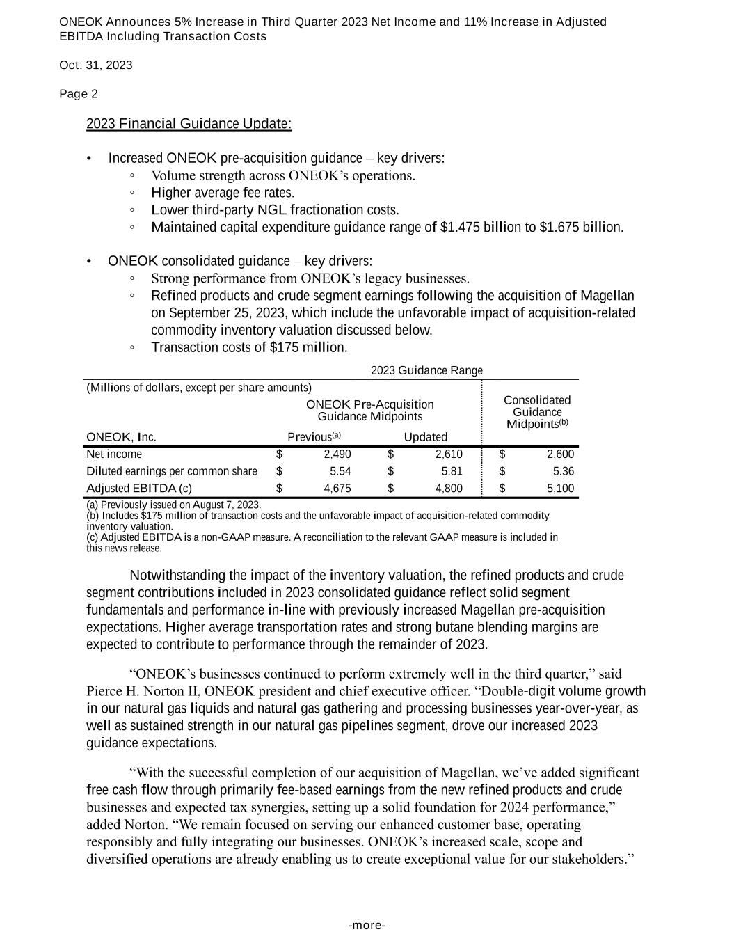 ONEOK Announces 5% Increase in Third Quarter 2023 Net Income and 11% Increase in Adjusted EBITDA Including Transaction Costs Oct. 31, 2023 Page 2 -more- 2023 Financial Guidance Update: • Increased ONEOK pre-acquisition guidance – key drivers: ◦ Volume strength across ONEOK’s operations. ◦ Higher average fee rates. ◦ Lower third-party NGL fractionation costs. ◦ Maintained capital expenditure guidance range of $1.475 billion to $1.675 billion. • ONEOK consolidated guidance – key drivers: ◦ Strong performance from ONEOK’s legacy businesses. ◦ Refined products and crude segment earnings following the acquisition of Magellan on September 25, 2023, which include the unfavorable impact of acquisition-related commodity inventory valuation discussed below. ◦ Transaction costs of $175 million. 2023 Guidance Range (Millions of dollars, except per share amounts) Consolidated Guidance Midpoints(b) ONEOK Pre-Acquisition Guidance Midpoints ONEOK, Inc. Previous(a) Updated Net income $ 2,490 $ 2,610 $ 2,600 Diluted earnings per common share $ 5.54 $ 5.81 $ 5.36 Adjusted EBITDA (c) $ 4,675 $ 4,800 $ 5,100 (a) Previously issued on August 7, 2023. (b) Includes $175 million of transaction costs and the unfavorable impact of acquisition-related commodity inventory valuation. (c) Adjusted EBITDA is a non-GAAP measure. A reconciliation to the relevant GAAP measure is included in this news release. Notwithstanding the impact of the inventory valuation, the refined products and crude segment contributions included in 2023 consolidated guidance reflect solid segment fundamentals and performance in-line with previously increased Magellan pre-acquisition expectations. Higher average transportation rates and strong butane blending margins are expected to contribute to performance through the remainder of 2023. “ONEOK’s businesses continued to perform extremely well in the third quarter,” said Pierce H. Norton II, ONEOK president and chief executive officer. “Double-digit volume growth in our natural gas liquids and natural gas gathering and processing businesses year-over-year, as well as sustained strength in our natural gas pipelines segment, drove our increased 2023 guidance expectations. “With the successful completion of our acquisition of Magellan, we’ve added significant free cash flow through primarily fee-based earnings from the new refined products and crude businesses and expected tax synergies, setting up a solid foundation for 2024 performance,” added Norton. “We remain focused on serving our enhanced customer base, operating responsibly and fully integrating our businesses. ONEOK’s increased scale, scope and diversified operations are already enabling us to create exceptional value for our stakeholders.”