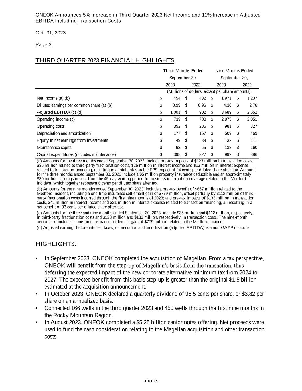 ONEOK Announces 5% Increase in Third Quarter 2023 Net Income and 11% Increase in Adjusted EBITDA Including Transaction Costs Oct. 31, 2023 Page 3 -more- THIRD QUARTER 2023 FINANCIAL HIGHLIGHTS Three Months Ended Nine Months Ended September 30, September 30, 2023 2022 2023 2022 (Millions of dollars, except per share amounts) Net income (a) (b) $ 454 $ 432 $ 1,971 $ 1,237 Diluted earnings per common share (a) (b) $ 0.99 $ 0.96 $ 4.36 $ 2.76 Adjusted EBITDA (c) (d) $ 1,001 $ 902 $ 3,689 $ 2,652 Operating income (c) $ 739 $ 700 $ 2,973 $ 2,051 Operating costs $ 352 $ 286 $ 981 $ 827 Depreciation and amortization $ 177 $ 157 $ 509 $ 469 Equity in net earnings from investments $ 49 $ 39 $ 132 $ 111 Maintenance capital $ 62 $ 65 $ 138 $ 160 Capital expenditures (includes maintenance) $ 398 $ 327 $ 992 $ 886 (a) Amounts for the three months ended September 30, 2023, include pre-tax impacts of $123 million in transaction costs, $35 million related to third-party fractionation costs, $26 million in interest income and $13 million in interest expense related to transaction financing, resulting in a total unfavorable EPS impact of 24 cents per diluted share after-tax. Amounts for the three months ended September 30, 2022 include a $5 million property insurance deductible and an approximately $30 million earnings impact from the 45-day waiting period for business interruption coverage related to the Medford incident, which together represent 6 cents per diluted share after tax. (b) Amounts for the nine months ended September 30, 2023, include a pre-tax benefit of $667 million related to the Medford incident, including a one-time insurance settlement gain of $779 million, offset partially by $112 million of third- party fractionation costs incurred through the first nine months of 2023; and pre-tax impacts of $133 million in transaction costs, $42 million in interest income and $21 million in interest expense related to transaction financing, all resulting in a net benefit of 93 cents per diluted share after tax. (c) Amounts for the three and nine months ended September 30, 2023, include $35 million and $112 million, respectively, in third-party fractionation costs and $123 million and $133 million, respectively, in transaction costs. The nine-month period also includes a one-time insurance settlement gain of $779 million related to the Medford incident. (d) Adjusted earnings before interest, taxes, depreciation and amortization (adjusted EBITDA) is a non-GAAP measure. HIGHLIGHTS: • In September 2023, ONEOK completed the acquisition of Magellan. From a tax perspective, ONEOK will benefit from the step-up of Magellan’s basis from the transaction, thus deferring the expected impact of the new corporate alternative minimum tax from 2024 to 2027. The expected benefit from this basis step-up is greater than the original $1.5 billion estimated at the acquisition announcement. • In October 2023, ONEOK declared a quarterly dividend of 95.5 cents per share, or $3.82 per share on an annualized basis. • Connected 166 wells in the third quarter 2023 and 450 wells through the first nine months in the Rocky Mountain Region. • In August 2023, ONEOK completed a $5.25 billion senior notes offering. Net proceeds were used to fund the cash consideration relating to the Magellan acquisition and other transaction costs.