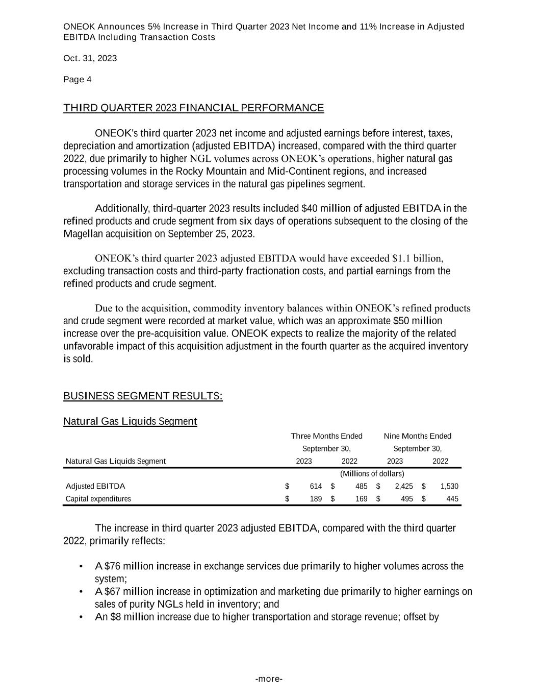 ONEOK Announces 5% Increase in Third Quarter 2023 Net Income and 11% Increase in Adjusted EBITDA Including Transaction Costs Oct. 31, 2023 Page 4 -more- THIRD QUARTER 2023 FINANCIAL PERFORMANCE ONEOK's third quarter 2023 net income and adjusted earnings before interest, taxes, depreciation and amortization (adjusted EBITDA) increased, compared with the third quarter 2022, due primarily to higher NGL volumes across ONEOK’s operations, higher natural gas processing volumes in the Rocky Mountain and Mid-Continent regions, and increased transportation and storage services in the natural gas pipelines segment. Additionally, third-quarter 2023 results included $40 million of adjusted EBITDA in the refined products and crude segment from six days of operations subsequent to the closing of the Magellan acquisition on September 25, 2023. ONEOK’s third quarter 2023 adjusted EBITDA would have exceeded $1.1 billion, excluding transaction costs and third-party fractionation costs, and partial earnings from the refined products and crude segment. Due to the acquisition, commodity inventory balances within ONEOK’s refined products and crude segment were recorded at market value, which was an approximate $50 million increase over the pre-acquisition value. ONEOK expects to realize the majority of the related unfavorable impact of this acquisition adjustment in the fourth quarter as the acquired inventory is sold. BUSINESS SEGMENT RESULTS: Natural Gas Liquids Segment Three Months Ended Nine Months Ended September 30, September 30, Natural Gas Liquids Segment 2023 2022 2023 2022 (Millions of dollars) Adjusted EBITDA $ 614 $ 485 $ 2,425 $ 1,530 Capital expenditures $ 189 $ 169 $ 495 $ 445 The increase in third quarter 2023 adjusted EBITDA, compared with the third quarter 2022, primarily reflects: • A $76 million increase in exchange services due primarily to higher volumes across the system; • A $67 million increase in optimization and marketing due primarily to higher earnings on sales of purity NGLs held in inventory; and • An $8 million increase due to higher transportation and storage revenue; offset by
