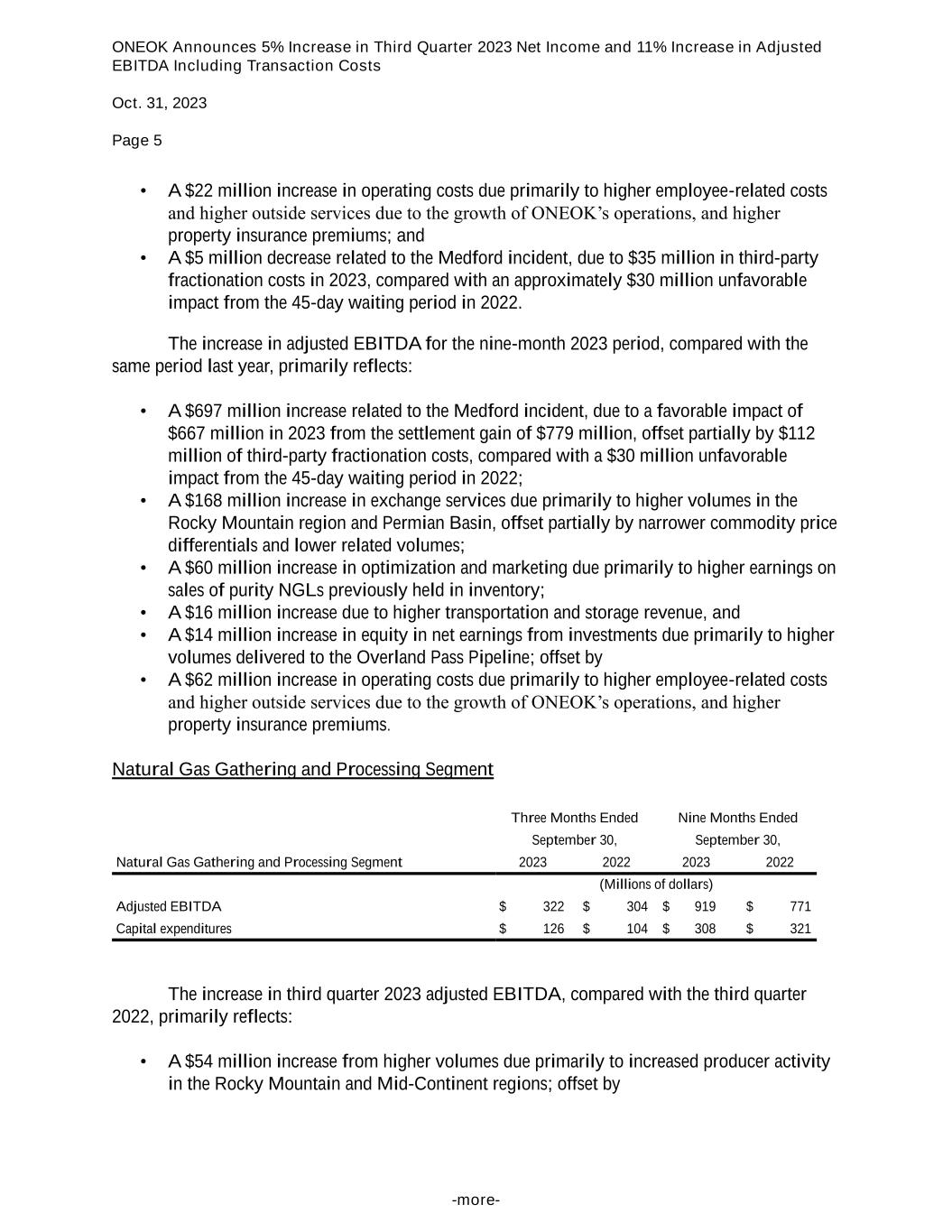 ONEOK Announces 5% Increase in Third Quarter 2023 Net Income and 11% Increase in Adjusted EBITDA Including Transaction Costs Oct. 31, 2023 Page 5 -more- • A $22 million increase in operating costs due primarily to higher employee-related costs and higher outside services due to the growth of ONEOK’s operations, and higher property insurance premiums; and • A $5 million decrease related to the Medford incident, due to $35 million in third-party fractionation costs in 2023, compared with an approximately $30 million unfavorable impact from the 45-day waiting period in 2022. The increase in adjusted EBITDA for the nine-month 2023 period, compared with the same period last year, primarily reflects: • A $697 million increase related to the Medford incident, due to a favorable impact of $667 million in 2023 from the settlement gain of $779 million, offset partially by $112 million of third-party fractionation costs, compared with a $30 million unfavorable impact from the 45-day waiting period in 2022; • A $168 million increase in exchange services due primarily to higher volumes in the Rocky Mountain region and Permian Basin, offset partially by narrower commodity price differentials and lower related volumes; • A $60 million increase in optimization and marketing due primarily to higher earnings on sales of purity NGLs previously held in inventory; • A $16 million increase due to higher transportation and storage revenue, and • A $14 million increase in equity in net earnings from investments due primarily to higher volumes delivered to the Overland Pass Pipeline; offset by • A $62 million increase in operating costs due primarily to higher employee-related costs and higher outside services due to the growth of ONEOK’s operations, and higher property insurance premiums. Natural Gas Gathering and Processing Segment Three Months Ended Nine Months Ended September 30, September 30, Natural Gas Gathering and Processing Segment 2023 2022 2023 2022 (Millions of dollars) Adjusted EBITDA $ 322 $ 304 $ 919 $ 771 Capital expenditures $ 126 $ 104 $ 308 $ 321 The increase in third quarter 2023 adjusted EBITDA, compared with the third quarter 2022, primarily reflects: • A $54 million increase from higher volumes due primarily to increased producer activity in the Rocky Mountain and Mid-Continent regions; offset by