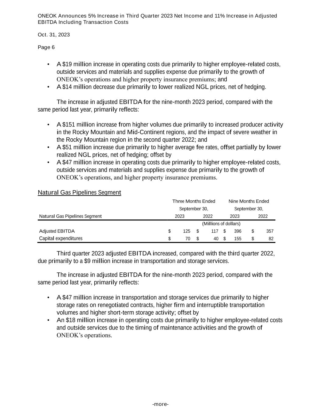 ONEOK Announces 5% Increase in Third Quarter 2023 Net Income and 11% Increase in Adjusted EBITDA Including Transaction Costs Oct. 31, 2023 Page 6 -more- • A $19 million increase in operating costs due primarily to higher employee-related costs, outside services and materials and supplies expense due primarily to the growth of ONEOK’s operations and higher property insurance premiums; and • A $14 million decrease due primarily to lower realized NGL prices, net of hedging. The increase in adjusted EBITDA for the nine-month 2023 period, compared with the same period last year, primarily reflects: • A $151 million increase from higher volumes due primarily to increased producer activity in the Rocky Mountain and Mid-Continent regions, and the impact of severe weather in the Rocky Mountain region in the second quarter 2022; and • A $51 million increase due primarily to higher average fee rates, offset partially by lower realized NGL prices, net of hedging; offset by • A $47 million increase in operating costs due primarily to higher employee-related costs, outside services and materials and supplies expense due primarily to the growth of ONEOK’s operations, and higher property insurance premiums. Natural Gas Pipelines Segment Three Months Ended Nine Months Ended September 30, September 30, Natural Gas Pipelines Segment 2023 2022 2023 2022 (Millions of dollars) Adjusted EBITDA $ 125 $ 117 $ 396 $ 357 Capital expenditures $ 70 $ 40 $ 155 $ 82 Third quarter 2023 adjusted EBITDA increased, compared with the third quarter 2022, due primarily to a $9 million increase in transportation and storage services. The increase in adjusted EBITDA for the nine-month 2023 period, compared with the same period last year, primarily reflects: • A $47 million increase in transportation and storage services due primarily to higher storage rates on renegotiated contracts, higher firm and interruptible transportation volumes and higher short-term storage activity; offset by • An $18 million increase in operating costs due primarily to higher employee-related costs and outside services due to the timing of maintenance activities and the growth of ONEOK’s operations.