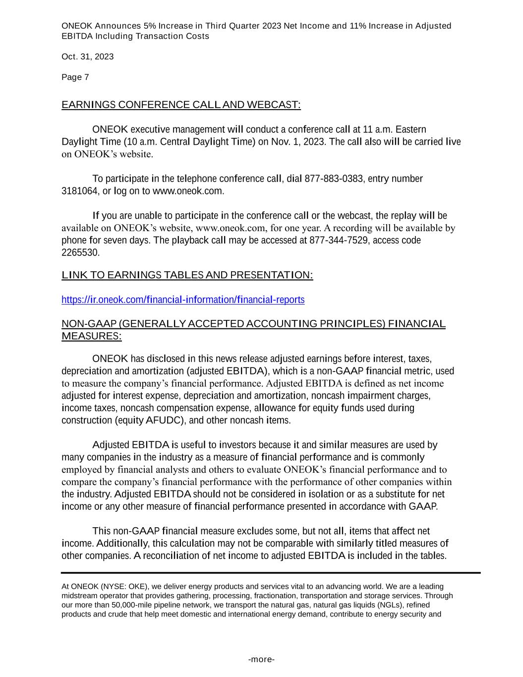 ONEOK Announces 5% Increase in Third Quarter 2023 Net Income and 11% Increase in Adjusted EBITDA Including Transaction Costs Oct. 31, 2023 Page 7 -more- EARNINGS CONFERENCE CALL AND WEBCAST: ONEOK executive management will conduct a conference call at 11 a.m. Eastern Daylight Time (10 a.m. Central Daylight Time) on Nov. 1, 2023. The call also will be carried live on ONEOK’s website. To participate in the telephone conference call, dial 877-883-0383, entry number 3181064, or log on to www.oneok.com. If you are unable to participate in the conference call or the webcast, the replay will be available on ONEOK’s website, www.oneok.com, for one year. A recording will be available by phone for seven days. The playback call may be accessed at 877-344-7529, access code 2265530. LINK TO EARNINGS TABLES AND PRESENTATION: https://ir.oneok.com/financial-information/financial-reports NON-GAAP (GENERALLY ACCEPTED ACCOUNTING PRINCIPLES) FINANCIAL MEASURES: ONEOK has disclosed in this news release adjusted earnings before interest, taxes, depreciation and amortization (adjusted EBITDA), which is a non-GAAP financial metric, used to measure the company’s financial performance. Adjusted EBITDA is defined as net income adjusted for interest expense, depreciation and amortization, noncash impairment charges, income taxes, noncash compensation expense, allowance for equity funds used during construction (equity AFUDC), and other noncash items. Adjusted EBITDA is useful to investors because it and similar measures are used by many companies in the industry as a measure of financial performance and is commonly employed by financial analysts and others to evaluate ONEOK’s financial performance and to compare the company’s financial performance with the performance of other companies within the industry. Adjusted EBITDA should not be considered in isolation or as a substitute for net income or any other measure of financial performance presented in accordance with GAAP. This non-GAAP financial measure excludes some, but not all, items that affect net income. Additionally, this calculation may not be comparable with similarly titled measures of other companies. A reconciliation of net income to adjusted EBITDA is included in the tables. At ONEOK (NYSE: OKE), we deliver energy products and services vital to an advancing world. We are a leading midstream operator that provides gathering, processing, fractionation, transportation and storage services. Through our more than 50,000-mile pipeline network, we transport the natural gas, natural gas liquids (NGLs), refined products and crude that help meet domestic and international energy demand, contribute to energy security and