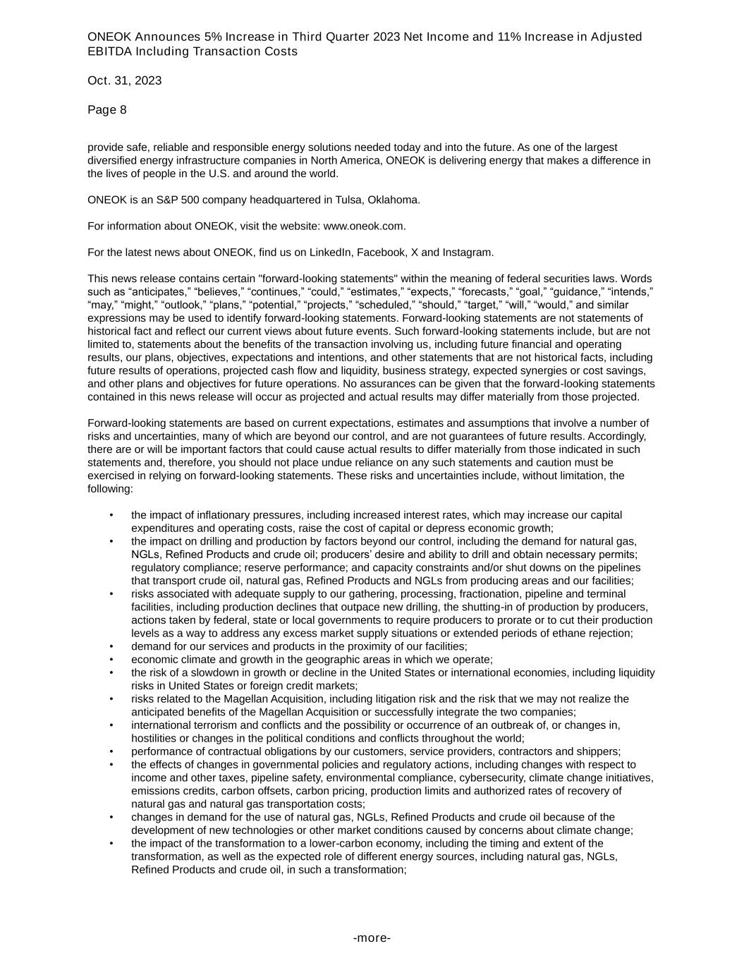ONEOK Announces 5% Increase in Third Quarter 2023 Net Income and 11% Increase in Adjusted EBITDA Including Transaction Costs Oct. 31, 2023 Page 8 -more- provide safe, reliable and responsible energy solutions needed today and into the future. As one of the largest diversified energy infrastructure companies in North America, ONEOK is delivering energy that makes a difference in the lives of people in the U.S. and around the world. ONEOK is an S&P 500 company headquartered in Tulsa, Oklahoma. For information about ONEOK, visit the website: www.oneok.com. For the latest news about ONEOK, find us on LinkedIn, Facebook, X and Instagram. This news release contains certain "forward-looking statements" within the meaning of federal securities laws. Words such as “anticipates,” “believes,” “continues,” “could,” “estimates,” “expects,” “forecasts,” “goal,” “guidance,” “intends,” “may,” “might,” “outlook,” “plans,” “potential,” “projects,” “scheduled,” “should,” “target,” “will,” “would,” and similar expressions may be used to identify forward-looking statements. Forward-looking statements are not statements of historical fact and reflect our current views about future events. Such forward-looking statements include, but are not limited to, statements about the benefits of the transaction involving us, including future financial and operating results, our plans, objectives, expectations and intentions, and other statements that are not historical facts, including future results of operations, projected cash flow and liquidity, business strategy, expected synergies or cost savings, and other plans and objectives for future operations. No assurances can be given that the forward-looking statements contained in this news release will occur as projected and actual results may differ materially from those projected. Forward-looking statements are based on current expectations, estimates and assumptions that involve a number of risks and uncertainties, many of which are beyond our control, and are not guarantees of future results. Accordingly, there are or will be important factors that could cause actual results to differ materially from those indicated in such statements and, therefore, you should not place undue reliance on any such statements and caution must be exercised in relying on forward-looking statements. These risks and uncertainties include, without limitation, the following: • the impact of inflationary pressures, including increased interest rates, which may increase our capital expenditures and operating costs, raise the cost of capital or depress economic growth; • the impact on drilling and production by factors beyond our control, including the demand for natural gas, NGLs, Refined Products and crude oil; producers’ desire and ability to drill and obtain necessary permits; regulatory compliance; reserve performance; and capacity constraints and/or shut downs on the pipelines that transport crude oil, natural gas, Refined Products and NGLs from producing areas and our facilities; • risks associated with adequate supply to our gathering, processing, fractionation, pipeline and terminal facilities, including production declines that outpace new drilling, the shutting-in of production by producers, actions taken by federal, state or local governments to require producers to prorate or to cut their production levels as a way to address any excess market supply situations or extended periods of ethane rejection; • demand for our services and products in the proximity of our facilities; • economic climate and growth in the geographic areas in which we operate; • the risk of a slowdown in growth or decline in the United States or international economies, including liquidity risks in United States or foreign credit markets; • risks related to the Magellan Acquisition, including litigation risk and the risk that we may not realize the anticipated benefits of the Magellan Acquisition or successfully integrate the two companies; • international terrorism and conflicts and the possibility or occurrence of an outbreak of, or changes in, hostilities or changes in the political conditions and conflicts throughout the world; • performance of contractual obligations by our customers, service providers, contractors and shippers; • the effects of changes in governmental policies and regulatory actions, including changes with respect to income and other taxes, pipeline safety, environmental compliance, cybersecurity, climate change initiatives, emissions credits, carbon offsets, carbon pricing, production limits and authorized rates of recovery of natural gas and natural gas transportation costs; • changes in demand for the use of natural gas, NGLs, Refined Products and crude oil because of the development of new technologies or other market conditions caused by concerns about climate change; • the impact of the transformation to a lower-carbon economy, including the timing and extent of the transformation, as well as the expected role of different energy sources, including natural gas, NGLs, Refined Products and crude oil, in such a transformation;