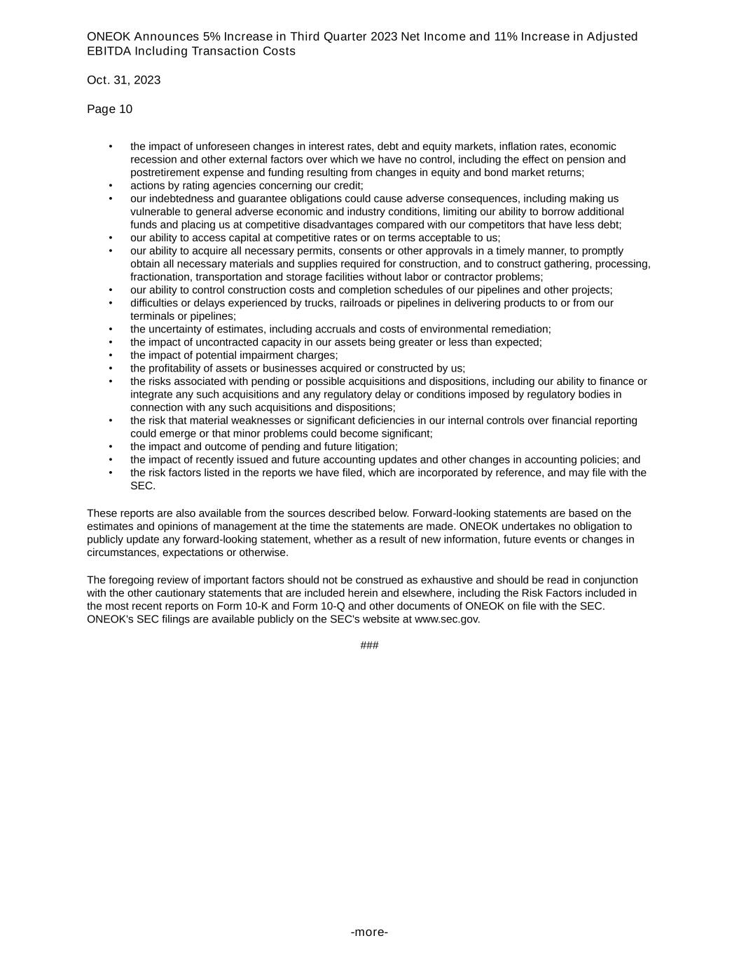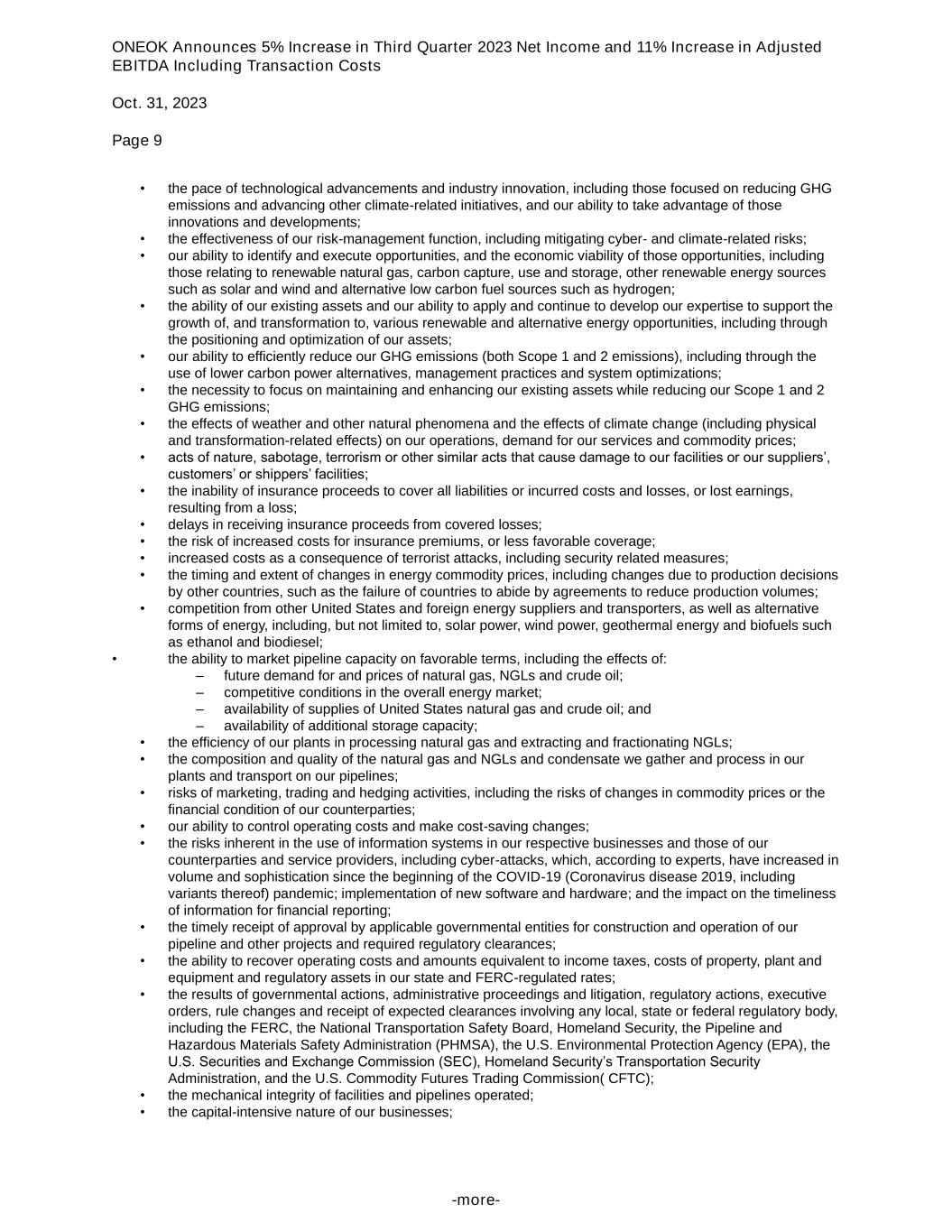 ONEOK Announces 5% Increase in Third Quarter 2023 Net Income and 11% Increase in Adjusted EBITDA Including Transaction Costs Oct. 31, 2023 Page 9 -more- • the pace of technological advancements and industry innovation, including those focused on reducing GHG emissions and advancing other climate-related initiatives, and our ability to take advantage of those innovations and developments; • the effectiveness of our risk-management function, including mitigating cyber- and climate-related risks; • our ability to identify and execute opportunities, and the economic viability of those opportunities, including those relating to renewable natural gas, carbon capture, use and storage, other renewable energy sources such as solar and wind and alternative low carbon fuel sources such as hydrogen; • the ability of our existing assets and our ability to apply and continue to develop our expertise to support the growth of, and transformation to, various renewable and alternative energy opportunities, including through the positioning and optimization of our assets; • our ability to efficiently reduce our GHG emissions (both Scope 1 and 2 emissions), including through the use of lower carbon power alternatives, management practices and system optimizations; • the necessity to focus on maintaining and enhancing our existing assets while reducing our Scope 1 and 2 GHG emissions; • the effects of weather and other natural phenomena and the effects of climate change (including physical and transformation-related effects) on our operations, demand for our services and commodity prices; • acts of nature, sabotage, terrorism or other similar acts that cause damage to our facilities or our suppliers’, customers’ or shippers’ facilities; • the inability of insurance proceeds to cover all liabilities or incurred costs and losses, or lost earnings, resulting from a loss; • delays in receiving insurance proceeds from covered losses; • the risk of increased costs for insurance premiums, or less favorable coverage; • increased costs as a consequence of terrorist attacks, including security related measures; • the timing and extent of changes in energy commodity prices, including changes due to production decisions by other countries, such as the failure of countries to abide by agreements to reduce production volumes; • competition from other United States and foreign energy suppliers and transporters, as well as alternative forms of energy, including, but not limited to, solar power, wind power, geothermal energy and biofuels such as ethanol and biodiesel; • the ability to market pipeline capacity on favorable terms, including the effects of: – future demand for and prices of natural gas, NGLs and crude oil; – competitive conditions in the overall energy market; – availability of supplies of United States natural gas and crude oil; and – availability of additional storage capacity; • the efficiency of our plants in processing natural gas and extracting and fractionating NGLs; • the composition and quality of the natural gas and NGLs and condensate we gather and process in our plants and transport on our pipelines; • risks of marketing, trading and hedging activities, including the risks of changes in commodity prices or the financial condition of our counterparties; • our ability to control operating costs and make cost-saving changes; • the risks inherent in the use of information systems in our respective businesses and those of our counterparties and service providers, including cyber-attacks, which, according to experts, have increased in volume and sophistication since the beginning of the COVID-19 (Coronavirus disease 2019, including variants thereof) pandemic; implementation of new software and hardware; and the impact on the timeliness of information for financial reporting; • the timely receipt of approval by applicable governmental entities for construction and operation of our pipeline and other projects and required regulatory clearances; • the ability to recover operating costs and amounts equivalent to income taxes, costs of property, plant and equipment and regulatory assets in our state and FERC-regulated rates; • the results of governmental actions, administrative proceedings and litigation, regulatory actions, executive orders, rule changes and receipt of expected clearances involving any local, state or federal regulatory body, including the FERC, the National Transportation Safety Board, Homeland Security, the Pipeline and Hazardous Materials Safety Administration (PHMSA), the U.S. Environmental Protection Agency (EPA), the U.S. Securities and Exchange Commission (SEC), Homeland Security’s Transportation Security Administration, and the U.S. Commodity Futures Trading Commission( CFTC); • the mechanical integrity of facilities and pipelines operated; • the capital-intensive nature of our businesses;