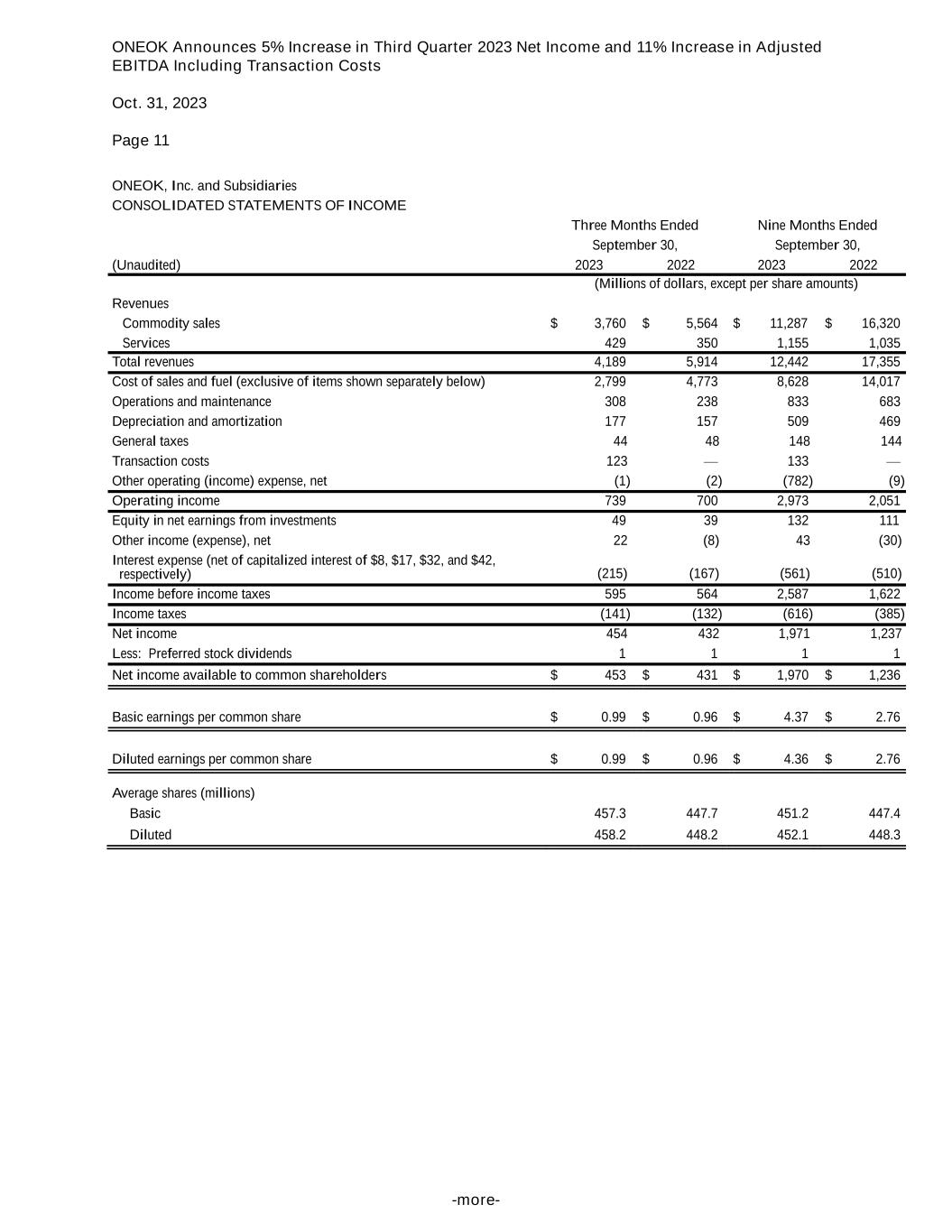 ONEOK Announces 5% Increase in Third Quarter 2023 Net Income and 11% Increase in Adjusted EBITDA Including Transaction Costs Oct. 31, 2023 Page 11 -more- ONEOK, Inc. and Subsidiaries CONSOLIDATED STATEMENTS OF INCOME Three Months Ended Nine Months Ended September 30, September 30, (Unaudited) 2023 2022 2023 2022 (Millions of dollars, except per share amounts) Revenues Commodity sales $ 3,760 $ 5,564 $ 11,287 $ 16,320 Services 429 350 1,155 1,035 Total revenues 4,189 5,914 12,442 17,355 Cost of sales and fuel (exclusive of items shown separately below) 2,799 4,773 8,628 14,017 Operations and maintenance 308 238 833 683 Depreciation and amortization 177 157 509 469 General taxes 44 48 148 144 Transaction costs 123 — 133 — Other operating (income) expense, net (1) (2) (782) (9) Operating income 739 700 2,973 2,051 Equity in net earnings from investments 49 39 132 111 Other income (expense), net 22 (8) 43 (30) Interest expense (net of capitalized interest of $8, $17, $32, and $42, respectively) (215) (167) (561) (510) Income before income taxes 595 564 2,587 1,622 Income taxes (141) (132) (616) (385) Net income 454 432 1,971 1,237 Less: Preferred stock dividends 1 1 1 1 Net income available to common shareholders $ 453 $ 431 $ 1,970 $ 1,236 Basic earnings per common share $ 0.99 $ 0.96 $ 4.37 $ 2.76 Diluted earnings per common share $ 0.99 $ 0.96 $ 4.36 $ 2.76 Average shares (millions) Basic 457.3 447.7 451.2 447.4 Diluted 458.2 448.2 452.1 448.3