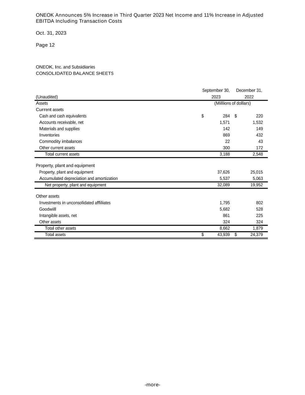 ONEOK Announces 5% Increase in Third Quarter 2023 Net Income and 11% Increase in Adjusted EBITDA Including Transaction Costs Oct. 31, 2023 Page 12 -more- ONEOK, Inc. and Subsidiaries CONSOLIDATED BALANCE SHEETS September 30, December 31, (Unaudited) 2023 2022 Assets (Millions of dollars) Current assets Cash and cash equivalents $ 284 $ 220 Accounts receivable, net 1,571 1,532 Materials and supplies 142 149 Inventories 869 432 Commodity imbalances 22 43 Other current assets 300 172 Total current assets 3,188 2,548 Property, plant and equipment Property, plant and equipment 37,626 25,015 Accumulated depreciation and amortization 5,537 5,063 Net property, plant and equipment 32,089 19,952 Other assets Investments in unconsolidated affiliates 1,795 802 Goodwill 5,682 528 Intangible assets, net 861 225 Other assets 324 324 Total other assets 8,662 1,879 Total assets $ 43,939 $ 24,379