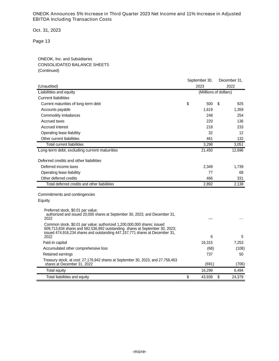 ONEOK Announces 5% Increase in Third Quarter 2023 Net Income and 11% Increase in Adjusted EBITDA Including Transaction Costs Oct. 31, 2023 Page 13 -more- ONEOK, Inc. and Subsidiaries CONSOLIDATED BALANCE SHEETS (Continued) September 30, December 31, (Unaudited) 2023 2022 Liabilities and equity (Millions of dollars) Current liabilities Current maturities of long-term debt $ 500 $ 925 Accounts payable 1,619 1,359 Commodity imbalances 248 254 Accrued taxes 220 136 Accrued interest 218 233 Operating lease liability 32 12 Other current liabilities 461 132 Total current liabilities 3,298 3,051 Long-term debt, excluding current maturities 21,450 12,696 Deferred credits and other liabilities Deferred income taxes 2,349 1,739 Operating lease liability 77 68 Other deferred credits 466 331 Total deferred credits and other liabilities 2,892 2,138 Commitments and contingencies Equity Preferred stock, $0.01 par value: authorized and issued 20,000 shares at September 30, 2023, and December 31, 2022 — — Common stock, $0.01 par value: authorized 1,200,000,000 shares; issued 609,713,834 shares and 582,536,892 outstanding shares at September 30, 2023; issued 474,916,234 shares and outstanding 447,157,771 shares at December 31, 2022 6 5 Paid-in capital 16,315 7,253 Accumulated other comprehensive loss (68) (108) Retained earnings 737 50 Treasury stock, at cost: 27,176,942 shares at September 30, 2023, and 27,758,463 shares at December 31, 2022 (691) (706) Total equity 16,299 6,494 Total liabilities and equity $ 43,939 $ 24,379