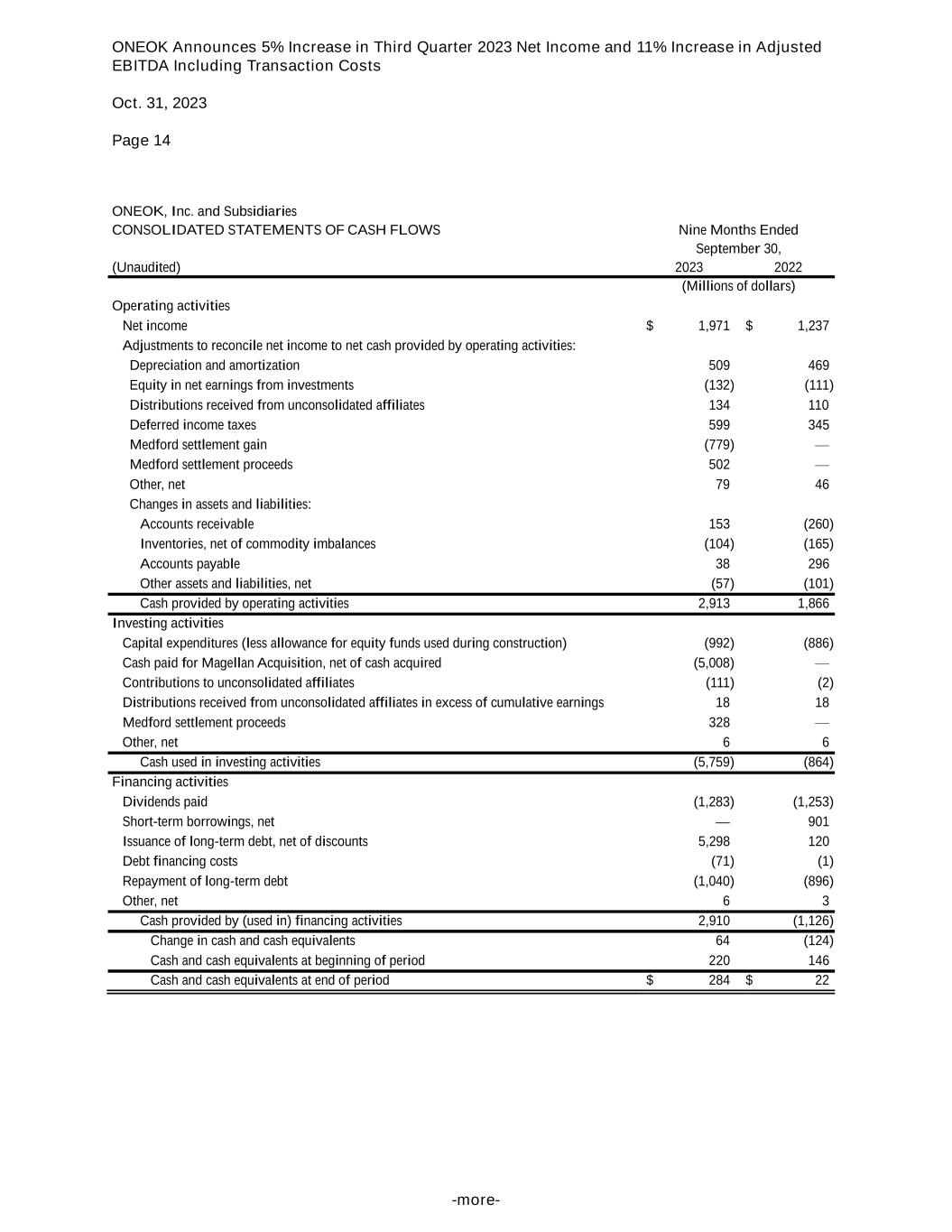 ONEOK Announces 5% Increase in Third Quarter 2023 Net Income and 11% Increase in Adjusted EBITDA Including Transaction Costs Oct. 31, 2023 Page 14 -more- ONEOK, Inc. and Subsidiaries CONSOLIDATED STATEMENTS OF CASH FLOWS Nine Months Ended September 30, (Unaudited) 2023 2022 (Millions of dollars) Operating activities Net income $ 1,971 $ 1,237 Adjustments to reconcile net income to net cash provided by operating activities: Depreciation and amortization 509 469 Equity in net earnings from investments (132) (111) Distributions received from unconsolidated affiliates 134 110 Deferred income taxes 599 345 Medford settlement gain (779) — Medford settlement proceeds 502 — Other, net 79 46 Changes in assets and liabilities: Accounts receivable 153 (260) Inventories, net of commodity imbalances (104) (165) Accounts payable 38 296 Other assets and liabilities, net (57) (101) Cash provided by operating activities 2,913 1,866 Investing activities Capital expenditures (less allowance for equity funds used during construction) (992) (886) Cash paid for Magellan Acquisition, net of cash acquired (5,008) — Contributions to unconsolidated affiliates (111) (2) Distributions received from unconsolidated affiliates in excess of cumulative earnings 18 18 Medford settlement proceeds 328 — Other, net 6 6 Cash used in investing activities (5,759) (864) Financing activities Dividends paid (1,283) (1,253) Short-term borrowings, net — 901 Issuance of long-term debt, net of discounts 5,298 120 Debt financing costs (71) (1) Repayment of long-term debt (1,040) (896) Other, net 6 3 Cash provided by (used in) financing activities 2,910 (1,126) Change in cash and cash equivalents 64 (124) Cash and cash equivalents at beginning of period 220 146 Cash and cash equivalents at end of period $ 284 $ 22