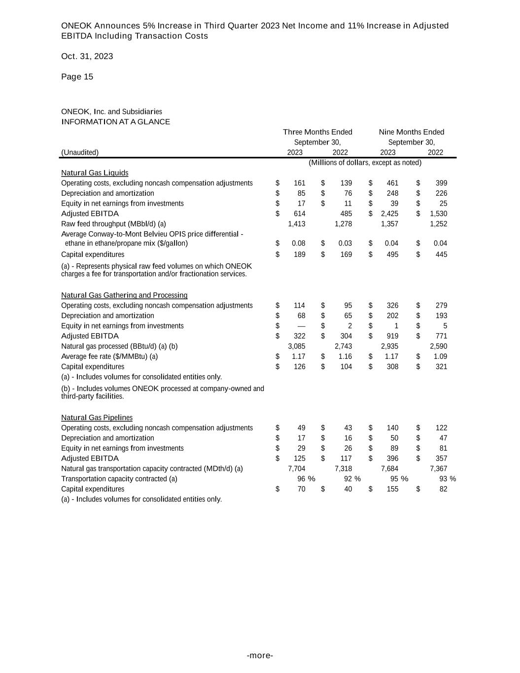 ONEOK Announces 5% Increase in Third Quarter 2023 Net Income and 11% Increase in Adjusted EBITDA Including Transaction Costs Oct. 31, 2023 Page 15 -more- ONEOK, Inc. and Subsidiaries INFORMATION AT A GLANCE Three Months Ended Nine Months Ended September 30, September 30, (Unaudited) 2023 2022 2023 2022 (Millions of dollars, except as noted) Natural Gas Liquids Operating costs, excluding noncash compensation adjustments $ 161 $ 139 $ 461 $ 399 Depreciation and amortization $ 85 $ 76 $ 248 $ 226 Equity in net earnings from investments $ 17 $ 11 $ 39 $ 25 Adjusted EBITDA $ 614 485 $ 2,425 $ 1,530 Raw feed throughput (MBbl/d) (a) 1,413 1,278 1,357 1,252 Average Conway-to-Mont Belvieu OPIS price differential - ethane in ethane/propane mix ($/gallon) $ 0.08 $ 0.03 $ 0.04 $ 0.04 Capital expenditures $ 189 $ 169 $ 495 $ 445 (a) - Represents physical raw feed volumes on which ONEOK charges a fee for transportation and/or fractionation services. Natural Gas Gathering and Processing Operating costs, excluding noncash compensation adjustments $ 114 $ 95 $ 326 $ 279 Depreciation and amortization $ 68 $ 65 $ 202 $ 193 Equity in net earnings from investments $ — $ 2 $ 1 $ 5 Adjusted EBITDA $ 322 $ 304 $ 919 $ 771 Natural gas processed (BBtu/d) (a) (b) 3,085 2,743 2,935 2,590 Average fee rate ($/MMBtu) (a) $ 1.17 $ 1.16 $ 1.17 $ 1.09 Capital expenditures $ 126 $ 104 $ 308 $ 321 (a) - Includes volumes for consolidated entities only. (b) - Includes volumes ONEOK processed at company-owned and third-party facilities. Natural Gas Pipelines Operating costs, excluding noncash compensation adjustments $ 49 $ 43 $ 140 $ 122 Depreciation and amortization $ 17 $ 16 $ 50 $ 47 Equity in net earnings from investments $ 29 $ 26 $ 89 $ 81 Adjusted EBITDA $ 125 $ 117 $ 396 $ 357 Natural gas transportation capacity contracted (MDth/d) (a) 7,704 7,318 7,684 7,367 Transportation capacity contracted (a) 96 % 92 % 95 % 93 % Capital expenditures $ 70 $ 40 $ 155 $ 82 (a) - Includes volumes for consolidated entities only.