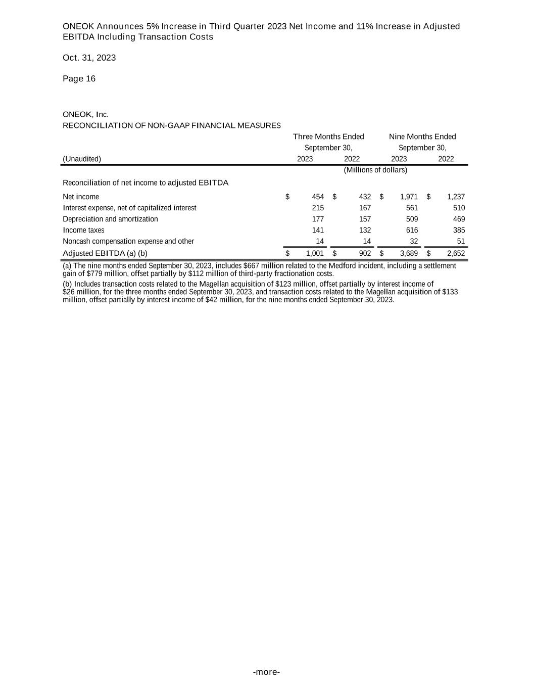 ONEOK Announces 5% Increase in Third Quarter 2023 Net Income and 11% Increase in Adjusted EBITDA Including Transaction Costs Oct. 31, 2023 Page 16 -more- ONEOK, Inc. RECONCILIATION OF NON-GAAP FINANCIAL MEASURES Three Months Ended Nine Months Ended September 30, September 30, (Unaudited) 2023 2022 2023 2022 (Millions of dollars) Reconciliation of net income to adjusted EBITDA Net income $ 454 $ 432 $ 1,971 $ 1,237 Interest expense, net of capitalized interest 215 167 561 510 Depreciation and amortization 177 157 509 469 Income taxes 141 132 616 385 Noncash compensation expense and other 14 14 32 51 Adjusted EBITDA (a) (b) $ 1,001 $ 902 $ 3,689 $ 2,652 (a) The nine months ended September 30, 2023, includes $667 million related to the Medford incident, including a settlement gain of $779 million, offset partially by $112 million of third-party fractionation costs. (b) Includes transaction costs related to the Magellan acquisition of $123 million, offset partially by interest income of $26 million, for the three months ended September 30, 2023, and transaction costs related to the Magellan acquisition of $133 million, offset partially by interest income of $42 million, for the nine months ended September 30, 2023.