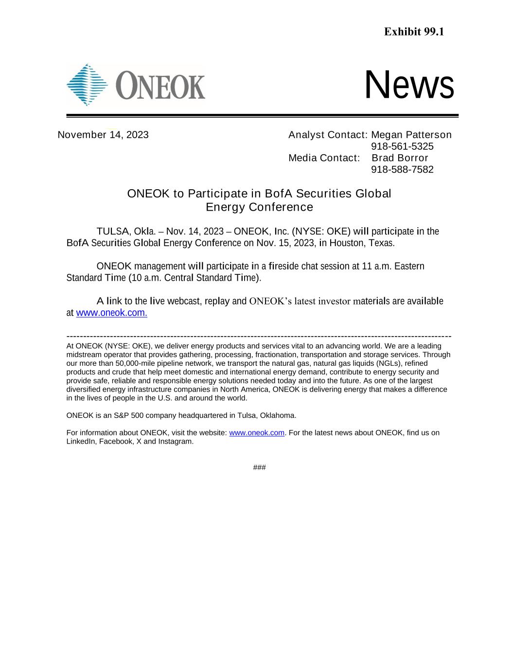 News ONEOK to Participate in BofA Securities Global Energy Conference TULSA, Okla. – Nov. 14, 2023 – ONEOK, Inc. (NYSE: OKE) will participate in the BofA Securities Global Energy Conference on Nov. 15, 2023, in Houston, Texas. ONEOK management will participate in a fireside chat session at 11 a.m. Eastern Standard Time (10 a.m. Central Standard Time). A link to the live webcast, replay and ONEOK’s latest investor materials are available at www.oneok.com. ------------------------------------------------------------------------------------------------------------------- At ONEOK (NYSE: OKE), we deliver energy products and services vital to an advancing world. We are a leading midstream operator that provides gathering, processing, fractionation, transportation and storage services. Through our more than 50,000-mile pipeline network, we transport the natural gas, natural gas liquids (NGLs), refined products and crude that help meet domestic and international energy demand, contribute to energy security and provide safe, reliable and responsible energy solutions needed today and into the future. As one of the largest diversified energy infrastructure companies in North America, ONEOK is delivering energy that makes a difference in the lives of people in the U.S. and around the world. ONEOK is an S&P 500 company headquartered in Tulsa, Oklahoma. For information about ONEOK, visit the website: www.oneok.com. For the latest news about ONEOK, find us on LinkedIn, Facebook, X and Instagram. ### Novembe 14, 2023 Analyst Contact: Megan Patterson 918-561-5325 Media Contact: Brad Borror 918-588-7582 r 14, 2023 Analyst Contact: Megan Patterson 918-561-5325 Media Contact: Brad Borror 918-5 8-7582 Exhibit 99.1