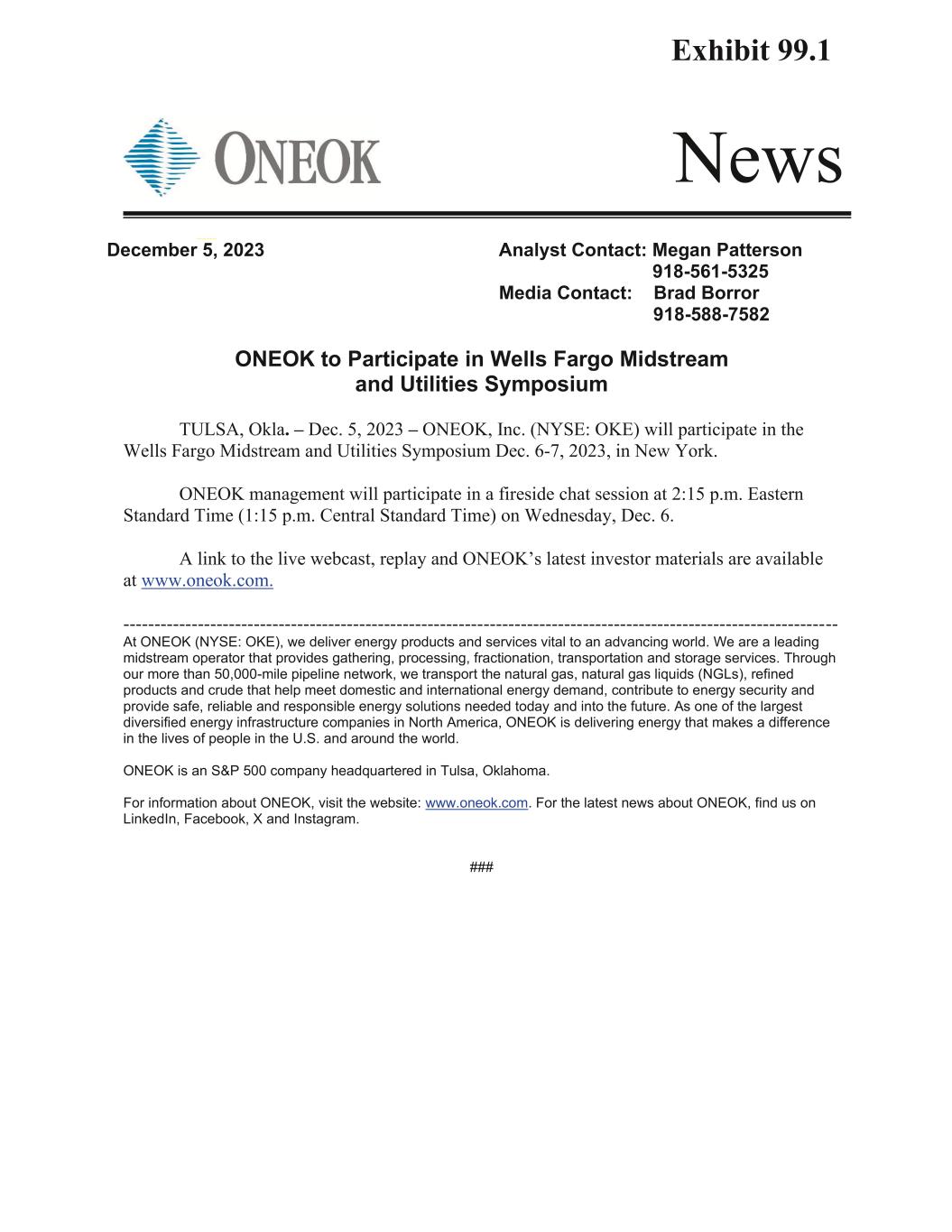 News ONEOK to Participate in Wells Fargo Midstream and Utilities Symposium TULSA, Okla. – Dec. 5, 2023 – ONEOK, Inc. (NYSE: OKE) will participate in the Wells Fargo Midstream and Utilities Symposium Dec. 6-7, 2023, in New York. ONEOK management will participate in a fireside chat session at 2:15 p.m. Eastern Standard Time (1:15 p.m. Central Standard Time) on Wednesday, Dec. 6. A link to the live webcast, replay and ONEOK’s latest investor materials are available at www.oneok.com. ------------------------------------------------------------------------------------------------------------------- At ONEOK (NYSE: OKE), we deliver energy products and services vital to an advancing world. We are a leading midstream operator that provides gathering, processing, fractionation, transportation and storage services. Through our more than 50,000-mile pipeline network, we transport the natural gas, natural gas liquids (NGLs), refined products and crude that help meet domestic and international energy demand, contribute to energy security and provide safe, reliable and responsible energy solutions needed today and into the future. As one of the largest diversified energy infrastructure companies in North America, ONEOK is delivering energy that makes a difference in the lives of people in the U.S. and around the world. ONEOK is an S&P 500 company headquartered in Tulsa, Oklahoma. For information about ONEOK, visit the website: www.oneok.com. For the latest news about ONEOK, find us on LinkedIn, Facebook, X and Instagram. ### Novembe 14, 2023 Analyst Contact: Megan Patterson 918-561-5325 Media Contact: Brad Borror 918-588-7582 Dec r 5, 2023 Analyst Contac : Megan Patterson 918-561-5325 Media Contac : Brad Borr 918-5 8-7582 Exhibit 99.1