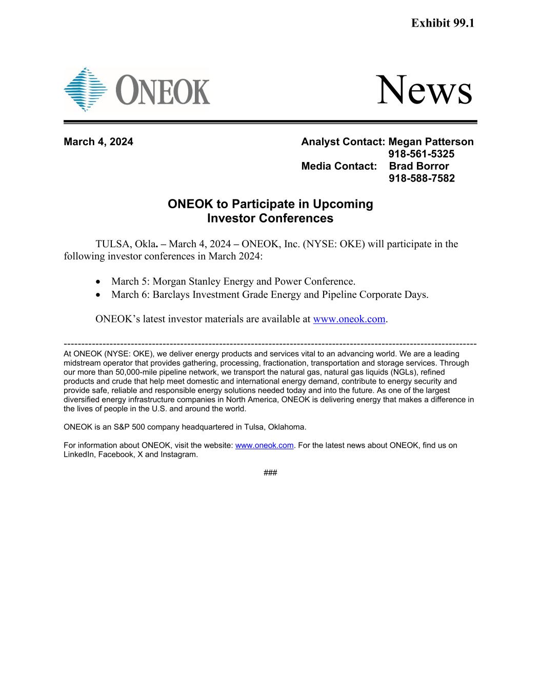 News ONEOK to Participate in Upcoming Investor Conferences TULSA, Okla. – March 4, 2024 – ONEOK, Inc. (NYSE: OKE) will participate in the following investor conferences in March 2024: • March 5: Morgan Stanley Energy and Power Conference. • March 6: Barclays Investment Grade Energy and Pipeline Corporate Days. ONEOK’s latest investor materials are available at www.oneok.com. --------------------------------------------------------------------------------------------------------------------- At ONEOK (NYSE: OKE), we deliver energy products and services vital to an advancing world. We are a leading midstream operator that provides gathering, processing, fractionation, transportation and storage services. Through our more than 50,000-mile pipeline network, we transport the natural gas, natural gas liquids (NGLs), refined products and crude that help meet domestic and international energy demand, contribute to energy security and provide safe, reliable and responsible energy solutions needed today and into the future. As one of the largest diversified energy infrastructure companies in North America, ONEOK is delivering energy that makes a difference in the lives of people in the U.S. and around the world. ONEOK is an S&P 500 company headquartered in Tulsa, Oklahoma. For information about ONEOK, visit the website: www.oneok.com. For the latest news about ONEOK, find us on LinkedIn, Facebook, X and Instagram. ### March 4, 2024 Analyst Contact: Megan Patterson 918-561-5325 Media Contact: Brad Borror 918-588-7582 Exhibit 99.1