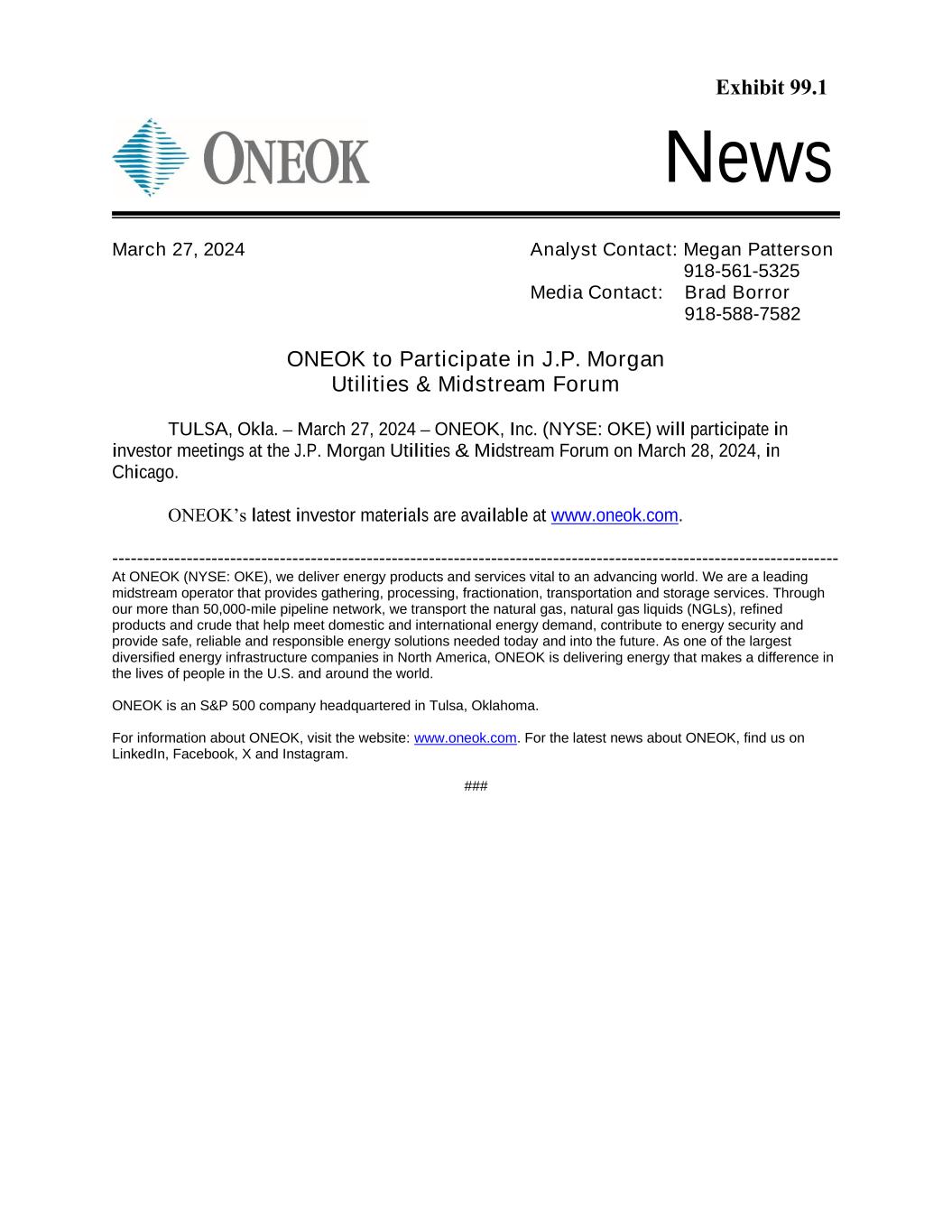 News ONEOK to Participate in J.P. Morgan Utilities & Midstream Forum TULSA, Okla. – March 27, 2024 – ONEOK, Inc. (NYSE: OKE) will participate in investor meetings at the J.P. Morgan Utilities & Midstream Forum on March 28, 2024, in Chicago. ONEOK’s latest investor materials are available at www.oneok.com. --------------------------------------------------------------------------------------------------------------------- At ONEOK (NYSE: OKE), we deliver energy products and services vital to an advancing world. We are a leading midstream operator that provides gathering, processing, fractionation, transportation and storage services. Through our more than 50,000-mile pipeline network, we transport the natural gas, natural gas liquids (NGLs), refined products and crude that help meet domestic and international energy demand, contribute to energy security and provide safe, reliable and responsible energy solutions needed today and into the future. As one of the largest diversified energy infrastructure companies in North America, ONEOK is delivering energy that makes a difference in the lives of people in the U.S. and around the world. ONEOK is an S&P 500 company headquartered in Tulsa, Oklahoma. For information about ONEOK, visit the website: www.oneok.com. For the latest news about ONEOK, find us on LinkedIn, Facebook, X and Instagram. ### March 27, 2024 Analyst Contact: Megan Patterson 918-561-5325 Media Contact: Brad Borror 918-588-7582 Exhibit 99.1
