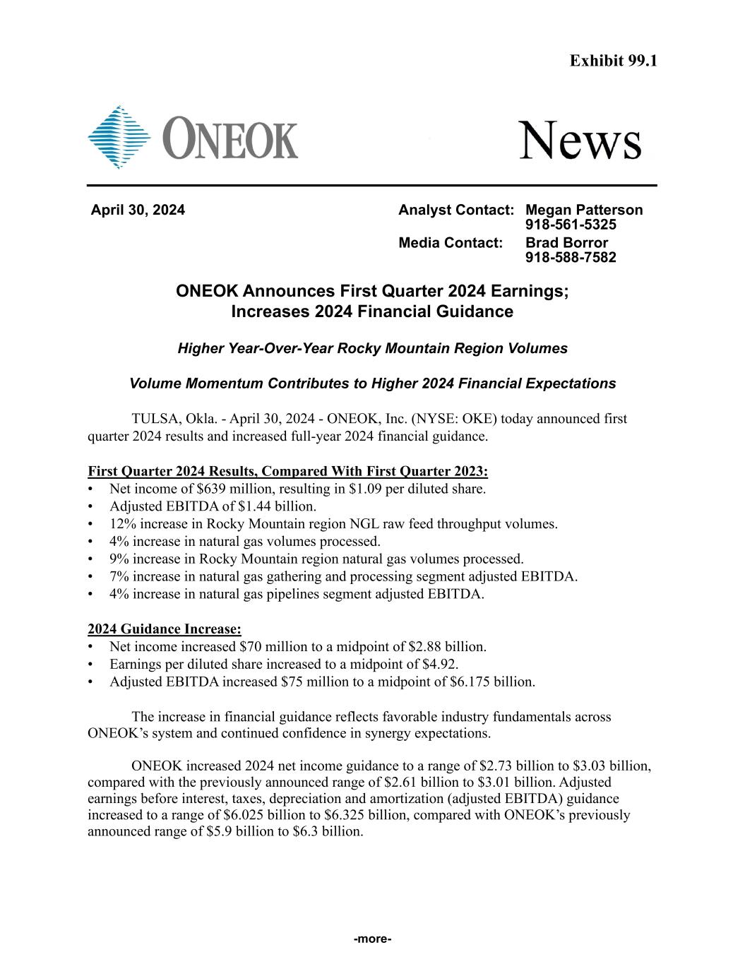 -more- April 30, 2024 Analyst Contact: Megan Patterson 918-561-5325 Media Contact: Brad Borror 918-588-7582 ONEOK Announces First Quarter 2024 Earnings; Increases 2024 Financial Guidance Higher Year-Over-Year Rocky Mountain Region Volumes Volume Momentum Contributes to Higher 2024 Financial Expectations TULSA, Okla. - April 30, 2024 - ONEOK, Inc. (NYSE: OKE) today announced first quarter 2024 results and increased full-year 2024 financial guidance. First Quarter 2024 Results, Compared With First Quarter 2023: • Net income of $639 million, resulting in $1.09 per diluted share. • Adjusted EBITDA of $1.44 billion. • 12% increase in Rocky Mountain region NGL raw feed throughput volumes. • 4% increase in natural gas volumes processed. • 9% increase in Rocky Mountain region natural gas volumes processed. • 7% increase in natural gas gathering and processing segment adjusted EBITDA. • 4% increase in natural gas pipelines segment adjusted EBITDA. 2024 Guidance Increase: • Net income increased $70 million to a midpoint of $2.88 billion. • Earnings per diluted share increased to a midpoint of $4.92. • Adjusted EBITDA increased $75 million to a midpoint of $6.175 billion. The increase in financial guidance reflects favorable industry fundamentals across ONEOK’s system and continued confidence in synergy expectations. ONEOK increased 2024 net income guidance to a range of $2.73 billion to $3.03 billion, compared with the previously announced range of $2.61 billion to $3.01 billion. Adjusted earnings before interest, taxes, depreciation and amortization (adjusted EBITDA) guidance increased to a range of $6.025 billion to $6.325 billion, compared with ONEOK’s previously announced range of $5.9 billion to $6.3 billion. Exhibit 99.1