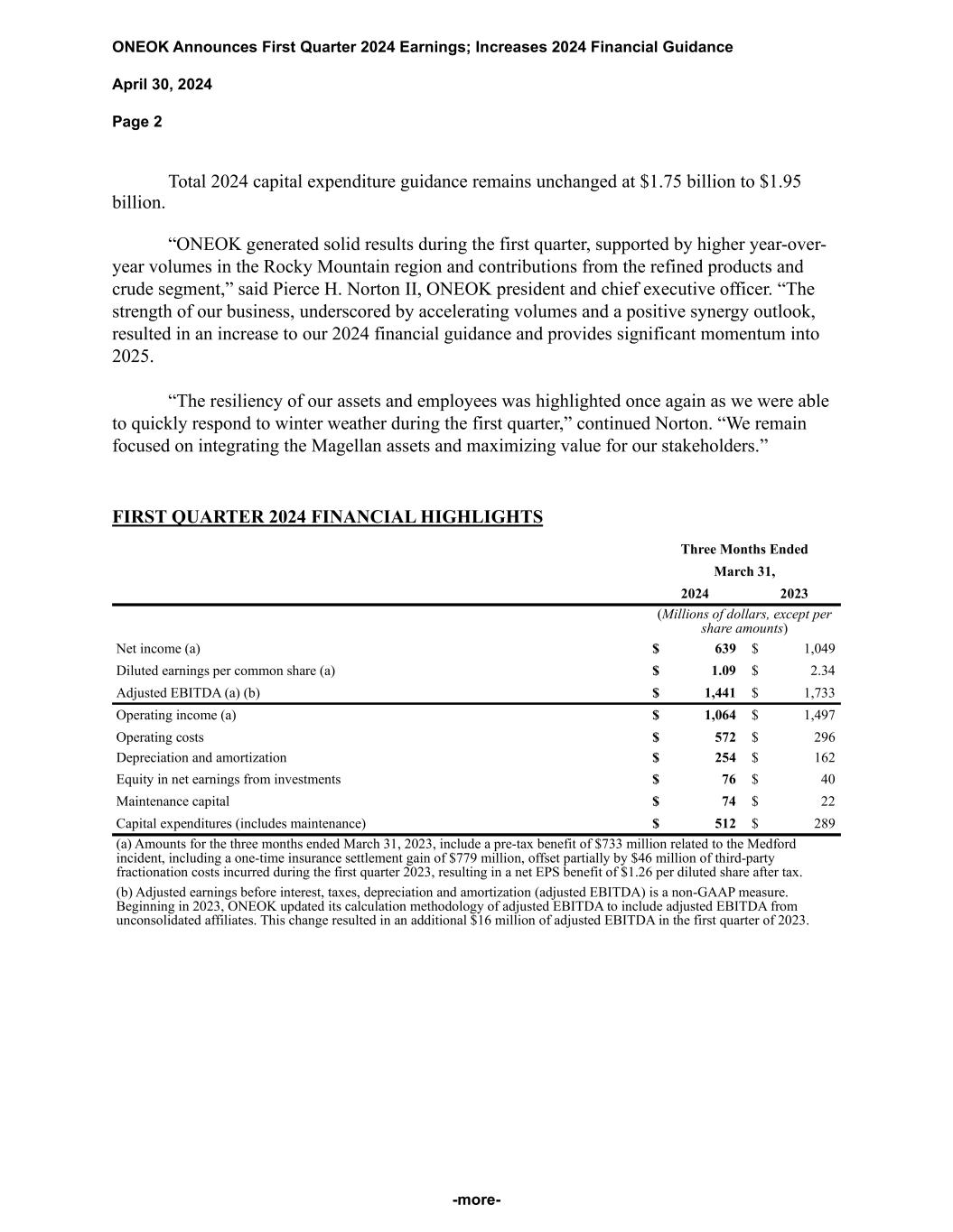 ONEOK Announces First Quarter 2024 Earnings; Increases 2024 Financial Guidance April 30, 2024 Page 2 -more- Total 2024 capital expenditure guidance remains unchanged at $1.75 billion to $1.95 billion. “ONEOK generated solid results during the first quarter, supported by higher year-over- year volumes in the Rocky Mountain region and contributions from the refined products and crude segment,” said Pierce H. Norton II, ONEOK president and chief executive officer. “The strength of our business, underscored by accelerating volumes and a positive synergy outlook, resulted in an increase to our 2024 financial guidance and provides significant momentum into 2025. “The resiliency of our assets and employees was highlighted once again as we were able to quickly respond to winter weather during the first quarter,” continued Norton. “We remain focused on integrating the Magellan assets and maximizing value for our stakeholders.” FIRST QUARTER 2024 FINANCIAL HIGHLIGHTS Three Months Ended March 31, 2024 2023 (Millions of dollars, except per share amounts) Net income (a) $ 639 $ 1,049 Diluted earnings per common share (a) $ 1.09 $ 2.34 Adjusted EBITDA (a) (b) $ 1,441 $ 1,733 Operating income (a) $ 1,064 $ 1,497 Operating costs $ 572 $ 296 Depreciation and amortization $ 254 $ 162 Equity in net earnings from investments $ 76 $ 40 Maintenance capital $ 74 $ 22 Capital expenditures (includes maintenance) $ 512 $ 289 (a) Amounts for the three months ended March 31, 2023, include a pre-tax benefit of $733 million related to the Medford incident, including a one-time insurance settlement gain of $779 million, offset partially by $46 million of third-party fractionation costs incurred during the first quarter 2023, resulting in a net EPS benefit of $1.26 per diluted share after tax. (b) Adjusted earnings before interest, taxes, depreciation and amortization (adjusted EBITDA) is a non-GAAP measure. Beginning in 2023, ONEOK updated its calculation methodology of adjusted EBITDA to include adjusted EBITDA from unconsolidated affiliates. This change resulted in an additional $16 million of adjusted EBITDA in the first quarter of 2023.