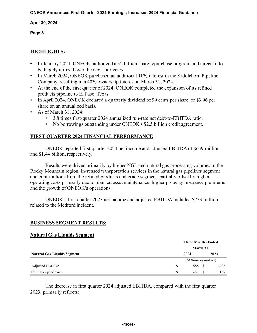 ONEOK Announces First Quarter 2024 Earnings; Increases 2024 Financial Guidance April 30, 2024 Page 3 -more- HIGHLIGHTS: • In January 2024, ONEOK authorized a $2 billion share repurchase program and targets it to be largely utilized over the next four years. • In March 2024, ONEOK purchased an additional 10% interest in the Saddlehorn Pipeline Company, resulting in a 40% ownership interest at March 31, 2024. • At the end of the first quarter of 2024, ONEOK completed the expansion of its refined products pipeline to El Paso, Texas. • In April 2024, ONEOK declared a quarterly dividend of 99 cents per share, or $3.96 per share on an annualized basis. • As of March 31, 2024: ◦ 3.8 times first-quarter 2024 annualized run-rate net debt-to-EBITDA ratio. ◦ No borrowings outstanding under ONEOK's $2.5 billion credit agreement. FIRST QUARTER 2024 FINANCIAL PERFORMANCE ONEOK reported first quarter 2024 net income and adjusted EBITDA of $639 million and $1.44 billion, respectively. Results were driven primarily by higher NGL and natural gas processing volumes in the Rocky Mountain region, increased transportation services in the natural gas pipelines segment and contributions from the refined products and crude segment, partially offset by higher operating costs primarily due to planned asset maintenance, higher property insurance premiums and the growth of ONEOK’s operations. ONEOK’s first quarter 2023 net income and adjusted EBITDA included $733 million related to the Medford incident. BUSINESS SEGMENT RESULTS: Natural Gas Liquids Segment Three Months Ended March 31, Natural Gas Liquids Segment 2024 2023 (Millions of dollars) Adjusted EBITDA $ 588 $ 1,283 Capital expenditures $ 253 $ 137 The decrease in first quarter 2024 adjusted EBITDA, compared with the first quarter 2023, primarily reflects: