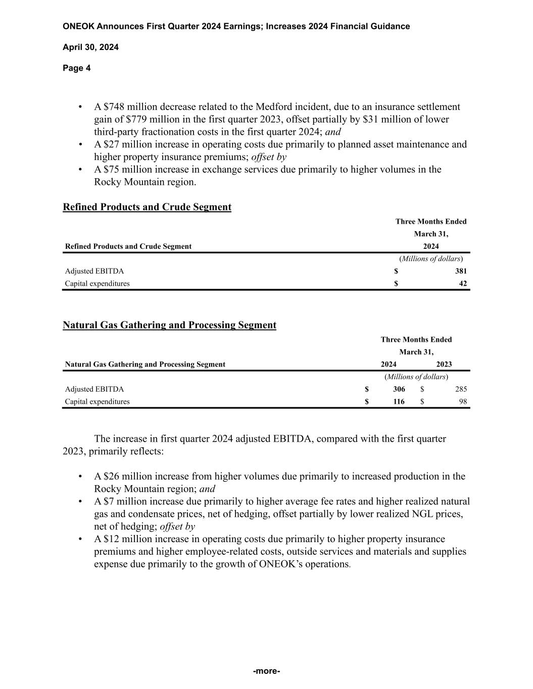 ONEOK Announces First Quarter 2024 Earnings; Increases 2024 Financial Guidance April 30, 2024 Page 4 -more- • A $748 million decrease related to the Medford incident, due to an insurance settlement gain of $779 million in the first quarter 2023, offset partially by $31 million of lower third-party fractionation costs in the first quarter 2024; and • A $27 million increase in operating costs due primarily to planned asset maintenance and higher property insurance premiums; offset by • A $75 million increase in exchange services due primarily to higher volumes in the Rocky Mountain region. Refined Products and Crude Segment Three Months Ended March 31, Refined Products and Crude Segment 2024 (Millions of dollars) Adjusted EBITDA $ 381 Capital expenditures $ 42 Natural Gas Gathering and Processing Segment Three Months Ended March 31, Natural Gas Gathering and Processing Segment 2024 2023 (Millions of dollars) Adjusted EBITDA $ 306 $ 285 Capital expenditures $ 116 $ 98 The increase in first quarter 2024 adjusted EBITDA, compared with the first quarter 2023, primarily reflects: • A $26 million increase from higher volumes due primarily to increased production in the Rocky Mountain region; and • A $7 million increase due primarily to higher average fee rates and higher realized natural gas and condensate prices, net of hedging, offset partially by lower realized NGL prices, net of hedging; offset by • A $12 million increase in operating costs due primarily to higher property insurance premiums and higher employee-related costs, outside services and materials and supplies expense due primarily to the growth of ONEOK’s operations.