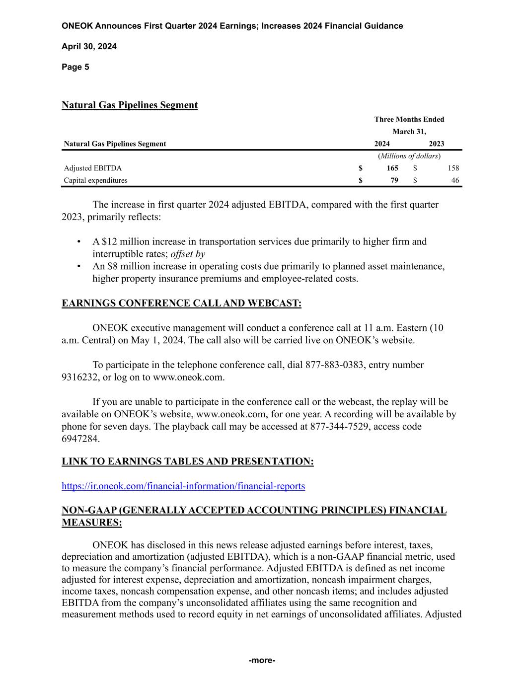 ONEOK Announces First Quarter 2024 Earnings; Increases 2024 Financial Guidance April 30, 2024 Page 5 -more- Natural Gas Pipelines Segment Three Months Ended March 31, Natural Gas Pipelines Segment 2024 2023 (Millions of dollars) Adjusted EBITDA $ 165 $ 158 Capital expenditures $ 79 $ 46 The increase in first quarter 2024 adjusted EBITDA, compared with the first quarter 2023, primarily reflects: • A $12 million increase in transportation services due primarily to higher firm and interruptible rates; offset by • An $8 million increase in operating costs due primarily to planned asset maintenance, higher property insurance premiums and employee-related costs. EARNINGS CONFERENCE CALL AND WEBCAST: ONEOK executive management will conduct a conference call at 11 a.m. Eastern (10 a.m. Central) on May 1, 2024. The call also will be carried live on ONEOK’s website. To participate in the telephone conference call, dial 877-883-0383, entry number 9316232, or log on to www.oneok.com. If you are unable to participate in the conference call or the webcast, the replay will be available on ONEOK’s website, www.oneok.com, for one year. A recording will be available by phone for seven days. The playback call may be accessed at 877-344-7529, access code 6947284. LINK TO EARNINGS TABLES AND PRESENTATION: https://ir.oneok.com/financial-information/financial-reports NON-GAAP (GENERALLY ACCEPTED ACCOUNTING PRINCIPLES) FINANCIAL MEASURES: ONEOK has disclosed in this news release adjusted earnings before interest, taxes, depreciation and amortization (adjusted EBITDA), which is a non-GAAP financial metric, used to measure the company’s financial performance. Adjusted EBITDA is defined as net income adjusted for interest expense, depreciation and amortization, noncash impairment charges, income taxes, noncash compensation expense, and other noncash items; and includes adjusted EBITDA from the company’s unconsolidated affiliates using the same recognition and measurement methods used to record equity in net earnings of unconsolidated affiliates. Adjusted