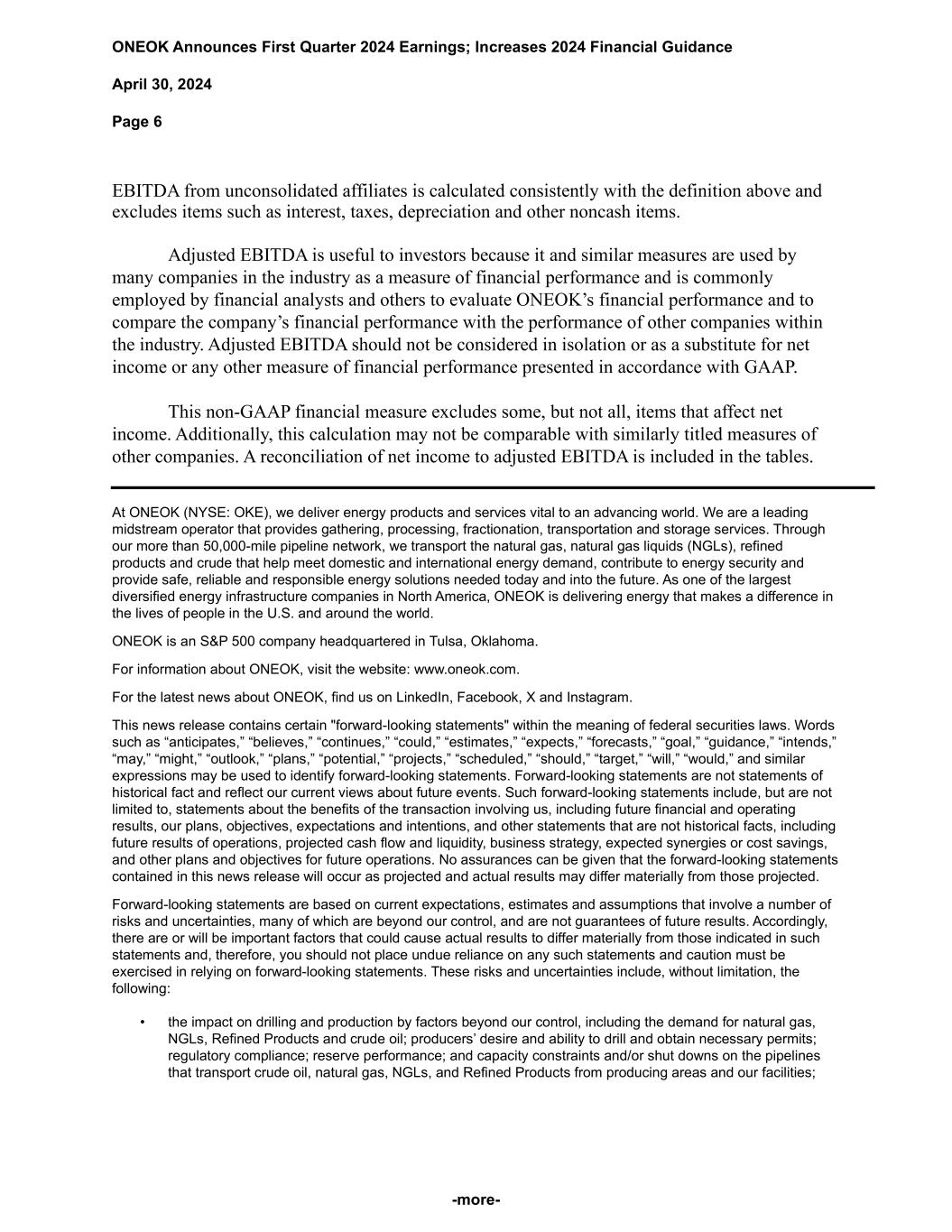 ONEOK Announces First Quarter 2024 Earnings; Increases 2024 Financial Guidance April 30, 2024 Page 6 -more- EBITDA from unconsolidated affiliates is calculated consistently with the definition above and excludes items such as interest, taxes, depreciation and other noncash items. Adjusted EBITDA is useful to investors because it and similar measures are used by many companies in the industry as a measure of financial performance and is commonly employed by financial analysts and others to evaluate ONEOK’s financial performance and to compare the company’s financial performance with the performance of other companies within the industry. Adjusted EBITDA should not be considered in isolation or as a substitute for net income or any other measure of financial performance presented in accordance with GAAP. This non-GAAP financial measure excludes some, but not all, items that affect net income. Additionally, this calculation may not be comparable with similarly titled measures of other companies. A reconciliation of net income to adjusted EBITDA is included in the tables. At ONEOK (NYSE: OKE), we deliver energy products and services vital to an advancing world. We are a leading midstream operator that provides gathering, processing, fractionation, transportation and storage services. Through our more than 50,000-mile pipeline network, we transport the natural gas, natural gas liquids (NGLs), refined products and crude that help meet domestic and international energy demand, contribute to energy security and provide safe, reliable and responsible energy solutions needed today and into the future. As one of the largest diversified energy infrastructure companies in North America, ONEOK is delivering energy that makes a difference in the lives of people in the U.S. and around the world. ONEOK is an S&P 500 company headquartered in Tulsa, Oklahoma. For information about ONEOK, visit the website: www.oneok.com. For the latest news about ONEOK, find us on LinkedIn, Facebook, X and Instagram. This news release contains certain "forward-looking statements" within the meaning of federal securities laws. Words such as “anticipates,” “believes,” “continues,” “could,” “estimates,” “expects,” “forecasts,” “goal,” “guidance,” “intends,” “may,” “might,” “outlook,” “plans,” “potential,” “projects,” “scheduled,” “should,” “target,” “will,” “would,” and similar expressions may be used to identify forward-looking statements. Forward-looking statements are not statements of historical fact and reflect our current views about future events. Such forward-looking statements include, but are not limited to, statements about the benefits of the transaction involving us, including future financial and operating results, our plans, objectives, expectations and intentions, and other statements that are not historical facts, including future results of operations, projected cash flow and liquidity, business strategy, expected synergies or cost savings, and other plans and objectives for future operations. No assurances can be given that the forward-looking statements contained in this news release will occur as projected and actual results may differ materially from those projected. Forward-looking statements are based on current expectations, estimates and assumptions that involve a number of risks and uncertainties, many of which are beyond our control, and are not guarantees of future results. Accordingly, there are or will be important factors that could cause actual results to differ materially from those indicated in such statements and, therefore, you should not place undue reliance on any such statements and caution must be exercised in relying on forward-looking statements. These risks and uncertainties include, without limitation, the following: • the impact on drilling and production by factors beyond our control, including the demand for natural gas, NGLs, Refined Products and crude oil; producers’ desire and ability to drill and obtain necessary permits; regulatory compliance; reserve performance; and capacity constraints and/or shut downs on the pipelines that transport crude oil, natural gas, NGLs, and Refined Products from producing areas and our facilities;