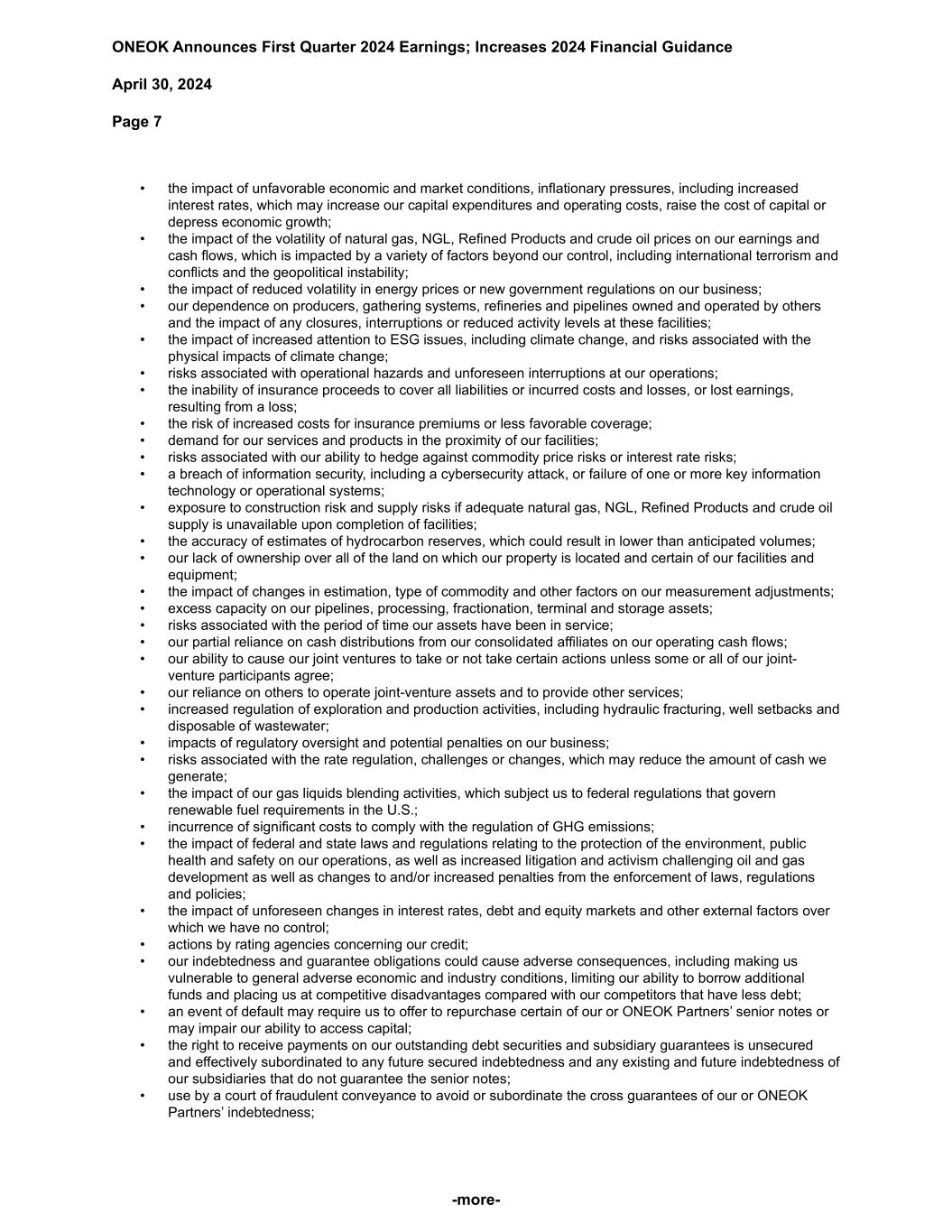 ONEOK Announces First Quarter 2024 Earnings; Increases 2024 Financial Guidance April 30, 2024 Page 7 -more- • the impact of unfavorable economic and market conditions, inflationary pressures, including increased interest rates, which may increase our capital expenditures and operating costs, raise the cost of capital or depress economic growth; • the impact of the volatility of natural gas, NGL, Refined Products and crude oil prices on our earnings and cash flows, which is impacted by a variety of factors beyond our control, including international terrorism and conflicts and the geopolitical instability; • the impact of reduced volatility in energy prices or new government regulations on our business; • our dependence on producers, gathering systems, refineries and pipelines owned and operated by others and the impact of any closures, interruptions or reduced activity levels at these facilities; • the impact of increased attention to ESG issues, including climate change, and risks associated with the physical impacts of climate change; • risks associated with operational hazards and unforeseen interruptions at our operations; • the inability of insurance proceeds to cover all liabilities or incurred costs and losses, or lost earnings, resulting from a loss; • the risk of increased costs for insurance premiums or less favorable coverage; • demand for our services and products in the proximity of our facilities; • risks associated with our ability to hedge against commodity price risks or interest rate risks; • a breach of information security, including a cybersecurity attack, or failure of one or more key information technology or operational systems; • exposure to construction risk and supply risks if adequate natural gas, NGL, Refined Products and crude oil supply is unavailable upon completion of facilities; • the accuracy of estimates of hydrocarbon reserves, which could result in lower than anticipated volumes; • our lack of ownership over all of the land on which our property is located and certain of our facilities and equipment; • the impact of changes in estimation, type of commodity and other factors on our measurement adjustments; • excess capacity on our pipelines, processing, fractionation, terminal and storage assets; • risks associated with the period of time our assets have been in service; • our partial reliance on cash distributions from our consolidated affiliates on our operating cash flows; • our ability to cause our joint ventures to take or not take certain actions unless some or all of our joint- venture participants agree; • our reliance on others to operate joint-venture assets and to provide other services; • increased regulation of exploration and production activities, including hydraulic fracturing, well setbacks and disposable of wastewater; • impacts of regulatory oversight and potential penalties on our business; • risks associated with the rate regulation, challenges or changes, which may reduce the amount of cash we generate; • the impact of our gas liquids blending activities, which subject us to federal regulations that govern renewable fuel requirements in the U.S.; • incurrence of significant costs to comply with the regulation of GHG emissions; • the impact of federal and state laws and regulations relating to the protection of the environment, public health and safety on our operations, as well as increased litigation and activism challenging oil and gas development as well as changes to and/or increased penalties from the enforcement of laws, regulations and policies; • the impact of unforeseen changes in interest rates, debt and equity markets and other external factors over which we have no control; • actions by rating agencies concerning our credit; • our indebtedness and guarantee obligations could cause adverse consequences, including making us vulnerable to general adverse economic and industry conditions, limiting our ability to borrow additional funds and placing us at competitive disadvantages compared with our competitors that have less debt; • an event of default may require us to offer to repurchase certain of our or ONEOK Partners’ senior notes or may impair our ability to access capital; • the right to receive payments on our outstanding debt securities and subsidiary guarantees is unsecured and effectively subordinated to any future secured indebtedness and any existing and future indebtedness of our subsidiaries that do not guarantee the senior notes; • use by a court of fraudulent conveyance to avoid or subordinate the cross guarantees of our or ONEOK Partners’ indebtedness;