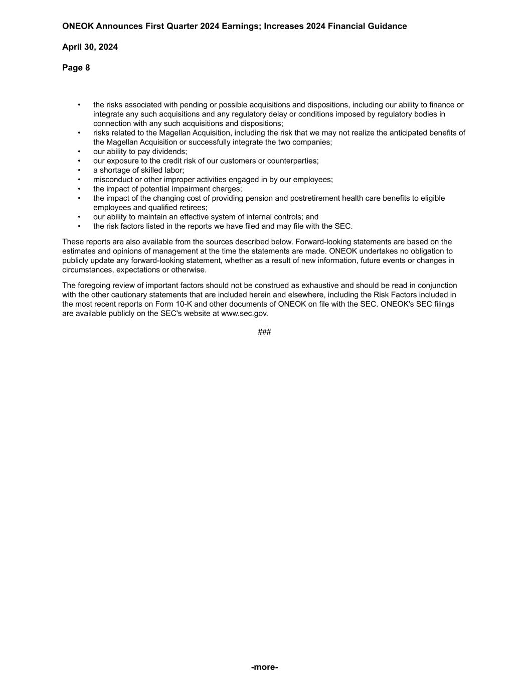 ONEOK Announces First Quarter 2024 Earnings; Increases 2024 Financial Guidance April 30, 2024 Page 8 -more- • the risks associated with pending or possible acquisitions and dispositions, including our ability to finance or integrate any such acquisitions and any regulatory delay or conditions imposed by regulatory bodies in connection with any such acquisitions and dispositions; • risks related to the Magellan Acquisition, including the risk that we may not realize the anticipated benefits of the Magellan Acquisition or successfully integrate the two companies; • our ability to pay dividends; • our exposure to the credit risk of our customers or counterparties; • a shortage of skilled labor; • misconduct or other improper activities engaged in by our employees; • the impact of potential impairment charges; • the impact of the changing cost of providing pension and postretirement health care benefits to eligible employees and qualified retirees; • our ability to maintain an effective system of internal controls; and • the risk factors listed in the reports we have filed and may file with the SEC. These reports are also available from the sources described below. Forward-looking statements are based on the estimates and opinions of management at the time the statements are made. ONEOK undertakes no obligation to publicly update any forward-looking statement, whether as a result of new information, future events or changes in circumstances, expectations or otherwise. The foregoing review of important factors should not be construed as exhaustive and should be read in conjunction with the other cautionary statements that are included herein and elsewhere, including the Risk Factors included in the most recent reports on Form 10-K and other documents of ONEOK on file with the SEC. ONEOK's SEC filings are available publicly on the SEC's website at www.sec.gov. ###