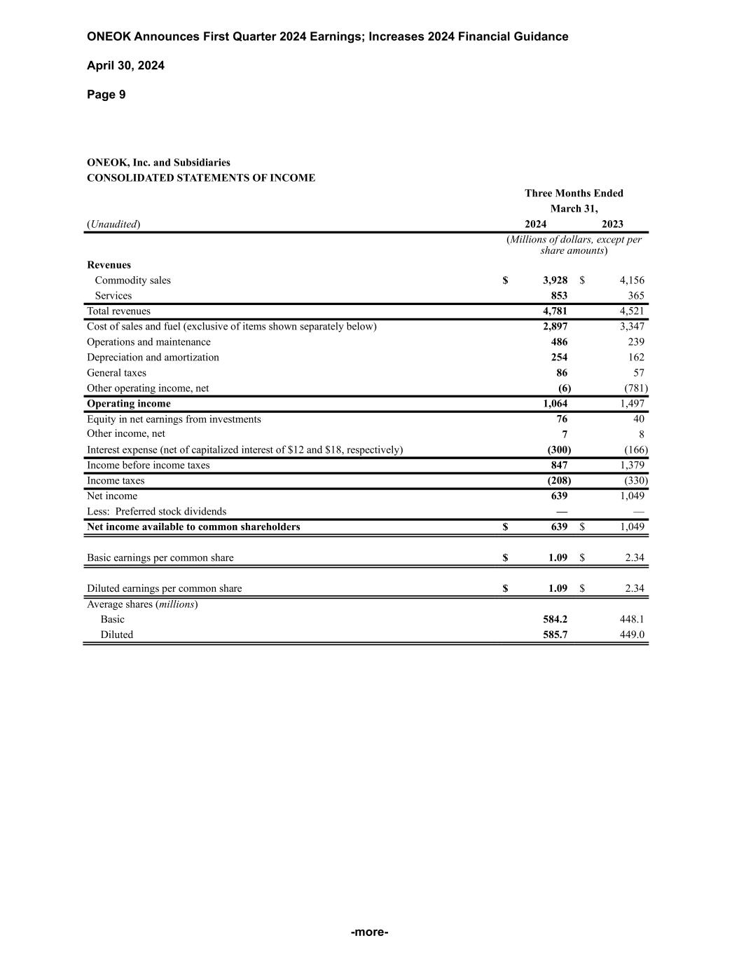 ONEOK Announces First Quarter 2024 Earnings; Increases 2024 Financial Guidance April 30, 2024 Page 9 -more- ONEOK, Inc. and Subsidiaries CONSOLIDATED STATEMENTS OF INCOME Three Months Ended March 31, (Unaudited) 2024 2023 (Millions of dollars, except per share amounts) Revenues Commodity sales $ 3,928 $ 4,156 Services 853 365 Total revenues 4,781 4,521 Cost of sales and fuel (exclusive of items shown separately below) 2,897 3,347 Operations and maintenance 486 239 Depreciation and amortization 254 162 General taxes 86 57 Other operating income, net (6) (781) Operating income 1,064 1,497 Equity in net earnings from investments 76 40 Other income, net 7 8 Interest expense (net of capitalized interest of $12 and $18, respectively) (300) (166) Income before income taxes 847 1,379 Income taxes (208) (330) Net income 639 1,049 Less: Preferred stock dividends — — Net income available to common shareholders $ 639 $ 1,049 Basic earnings per common share $ 1.09 $ 2.34 Diluted earnings per common share $ 1.09 $ 2.34 Average shares (millions) Basic 584.2 448.1 Diluted 585.7 449.0