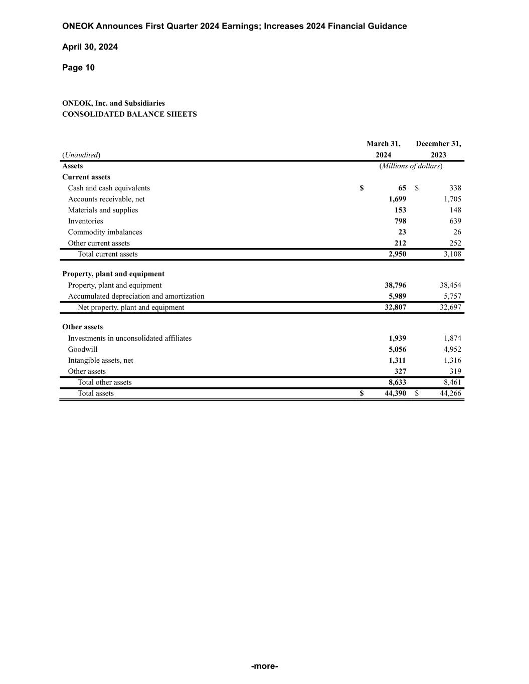 ONEOK Announces First Quarter 2024 Earnings; Increases 2024 Financial Guidance April 30, 2024 Page 10 -more- ONEOK, Inc. and Subsidiaries CONSOLIDATED BALANCE SHEETS March 31, December 31, (Unaudited) 2024 2023 Assets (Millions of dollars) Current assets Cash and cash equivalents $ 65 $ 338 Accounts receivable, net 1,699 1,705 Materials and supplies 153 148 Inventories 798 639 Commodity imbalances 23 26 Other current assets 212 252 Total current assets 2,950 3,108 Property, plant and equipment Property, plant and equipment 38,796 38,454 Accumulated depreciation and amortization 5,989 5,757 Net property, plant and equipment 32,807 32,697 Other assets Investments in unconsolidated affiliates 1,939 1,874 Goodwill 5,056 4,952 Intangible assets, net 1,311 1,316 Other assets 327 319 Total other assets 8,633 8,461 Total assets $ 44,390 $ 44,266